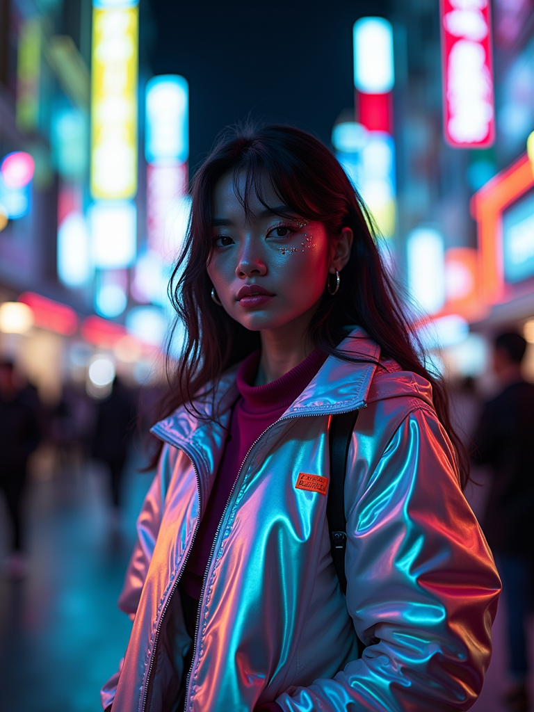 Walking through the streets of Tokyo at night. Holographic jacket, neon eyeliner, futuristic style . AI cinematic photography.