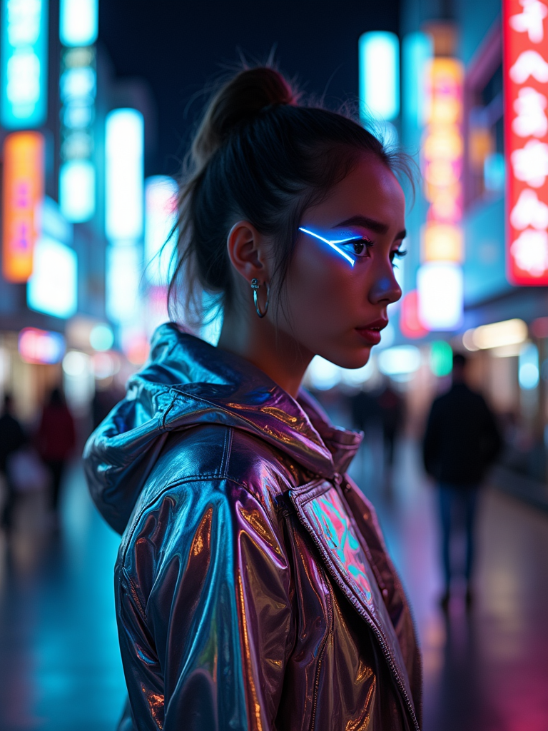 Walking through the streets of Tokyo at night. Holographic jacket, neon eyeliner, futuristic style . AI cinematic photography.