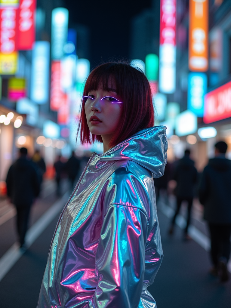 Walking through the streets of Tokyo at night. Holographic jacket, neon eyeliner, futuristic style . AI cinematic photography.