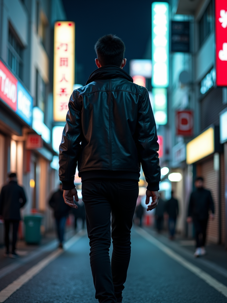 Walking through the streets of Tokyo at night. Leather jacket, cyberpunk techwear, glowing background. AI cinematic photography.
