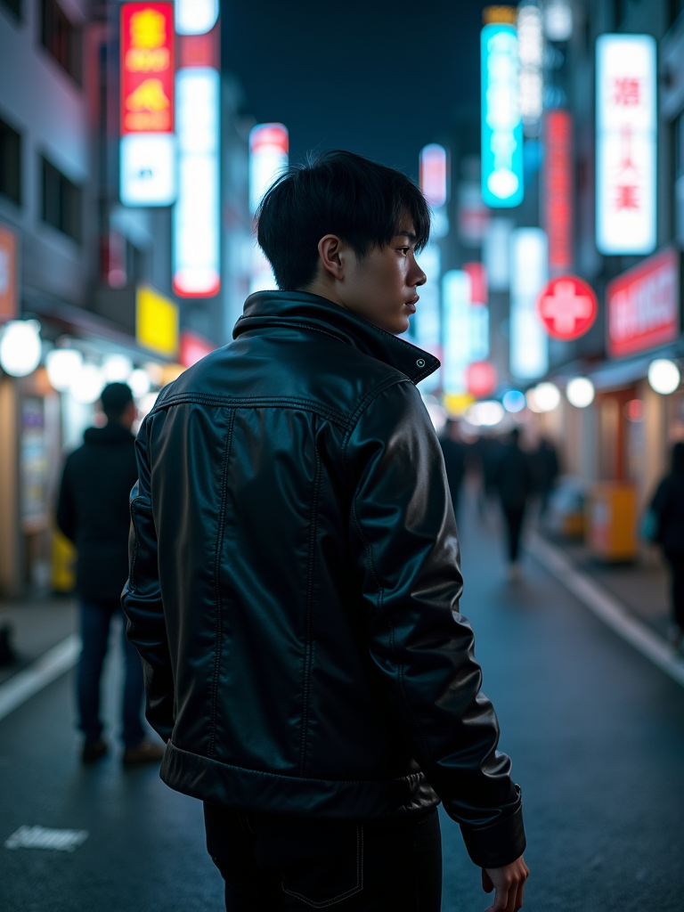 Walking through the streets of Tokyo at night. Leather jacket, cyberpunk techwear, glowing background. AI cinematic photography.