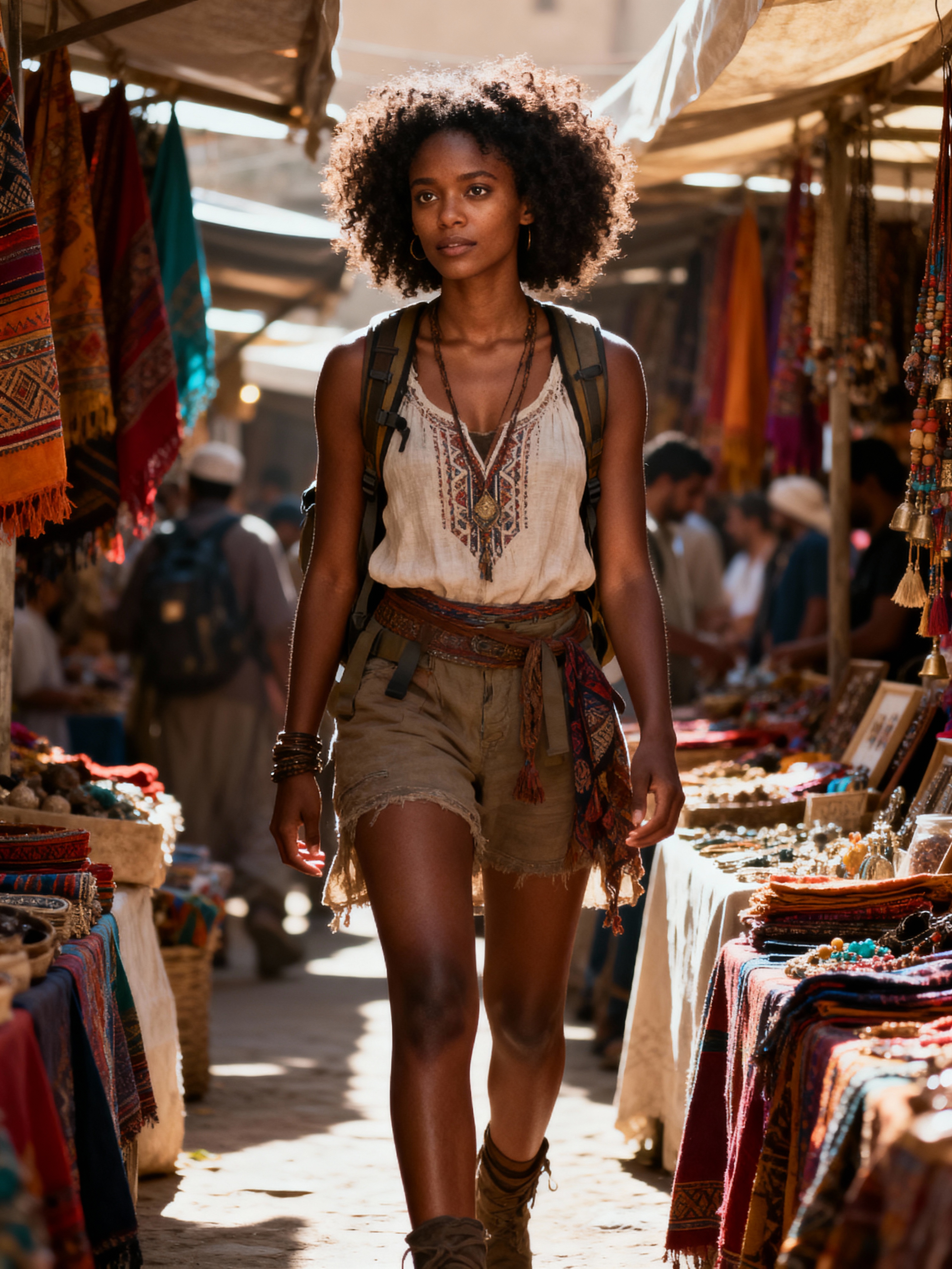 wanderlust feminine model browsing stalls in a bustling local market