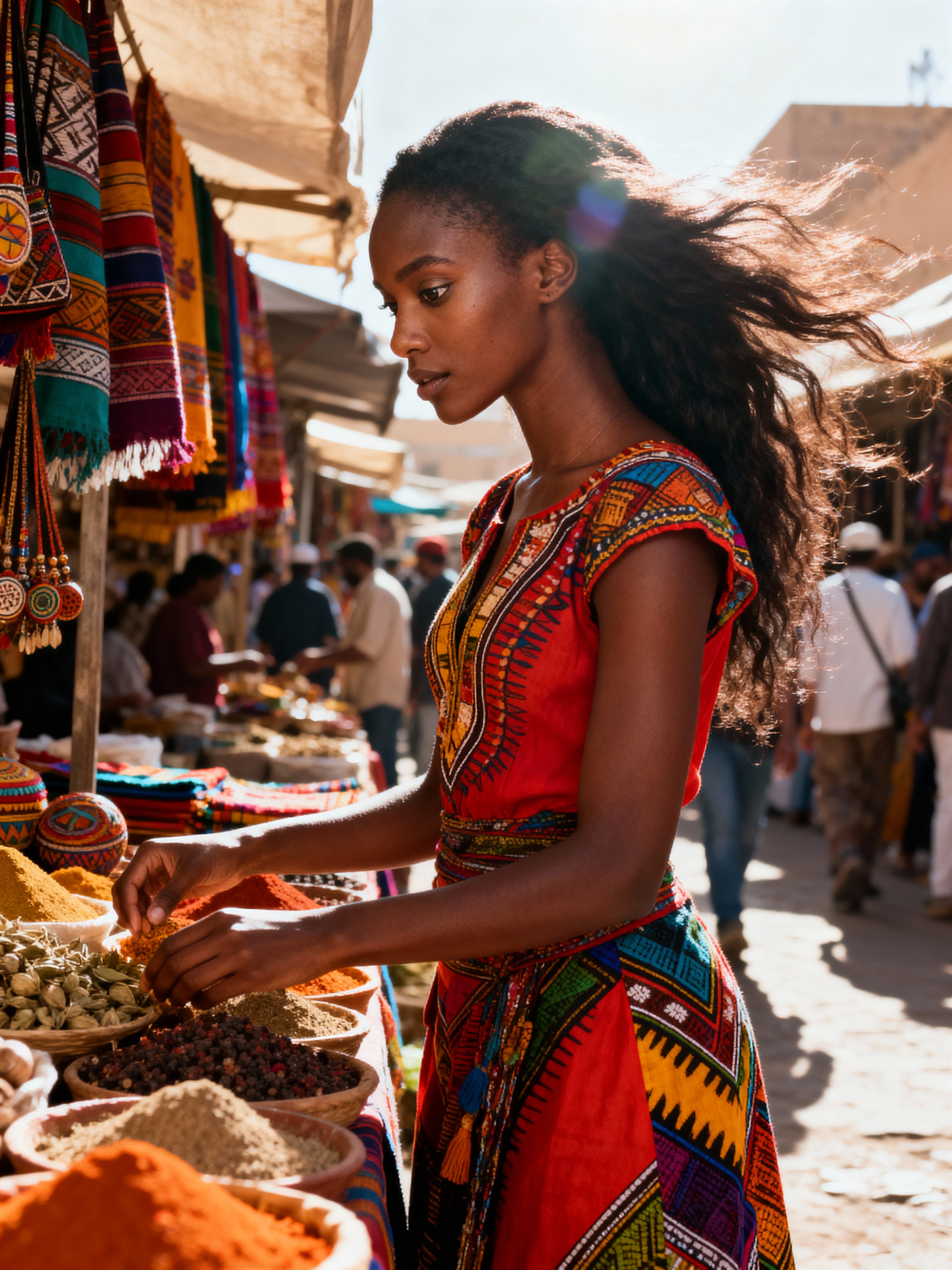 wanderlust feminine model browsing stalls in a bustling local market