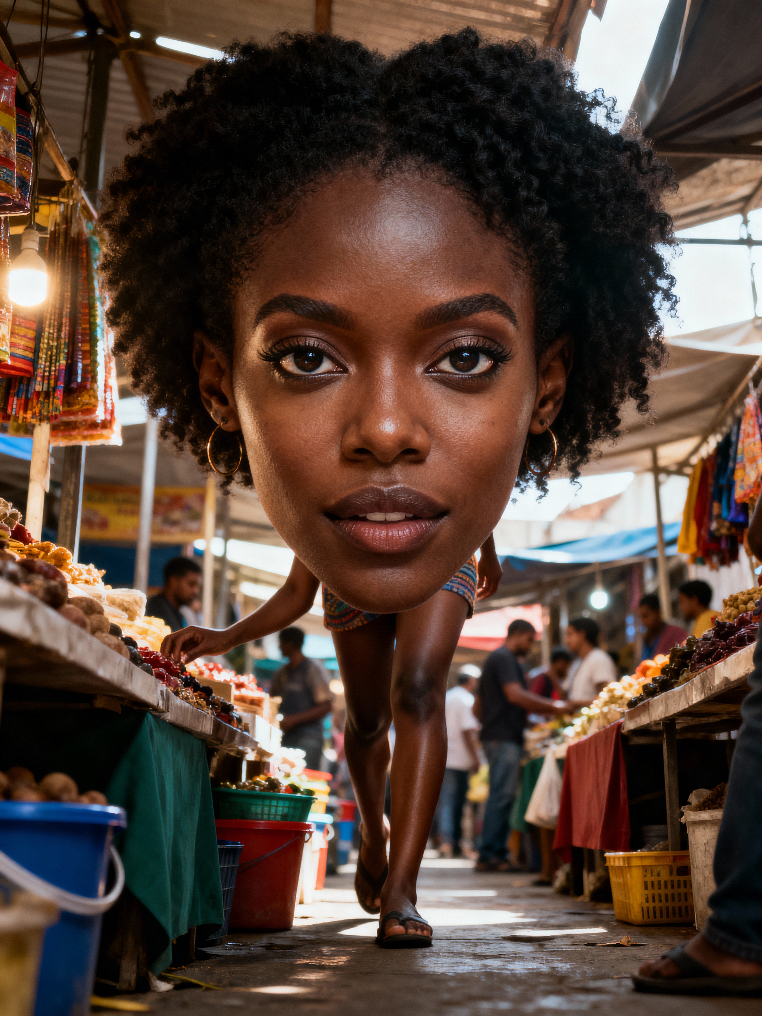 wanderlust feminine model browsing stalls in a bustling local market