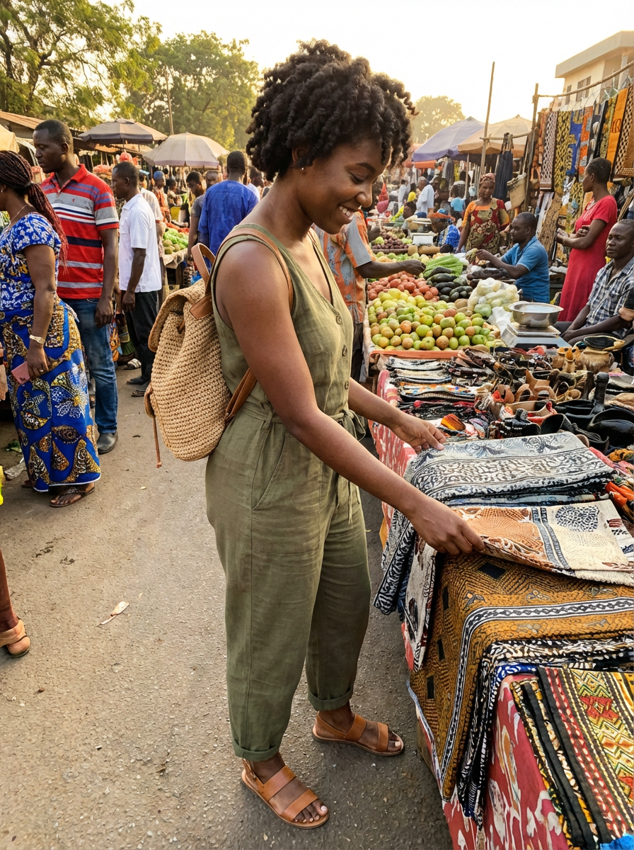 wanderlust feminine model browsing stalls in a bustling local market