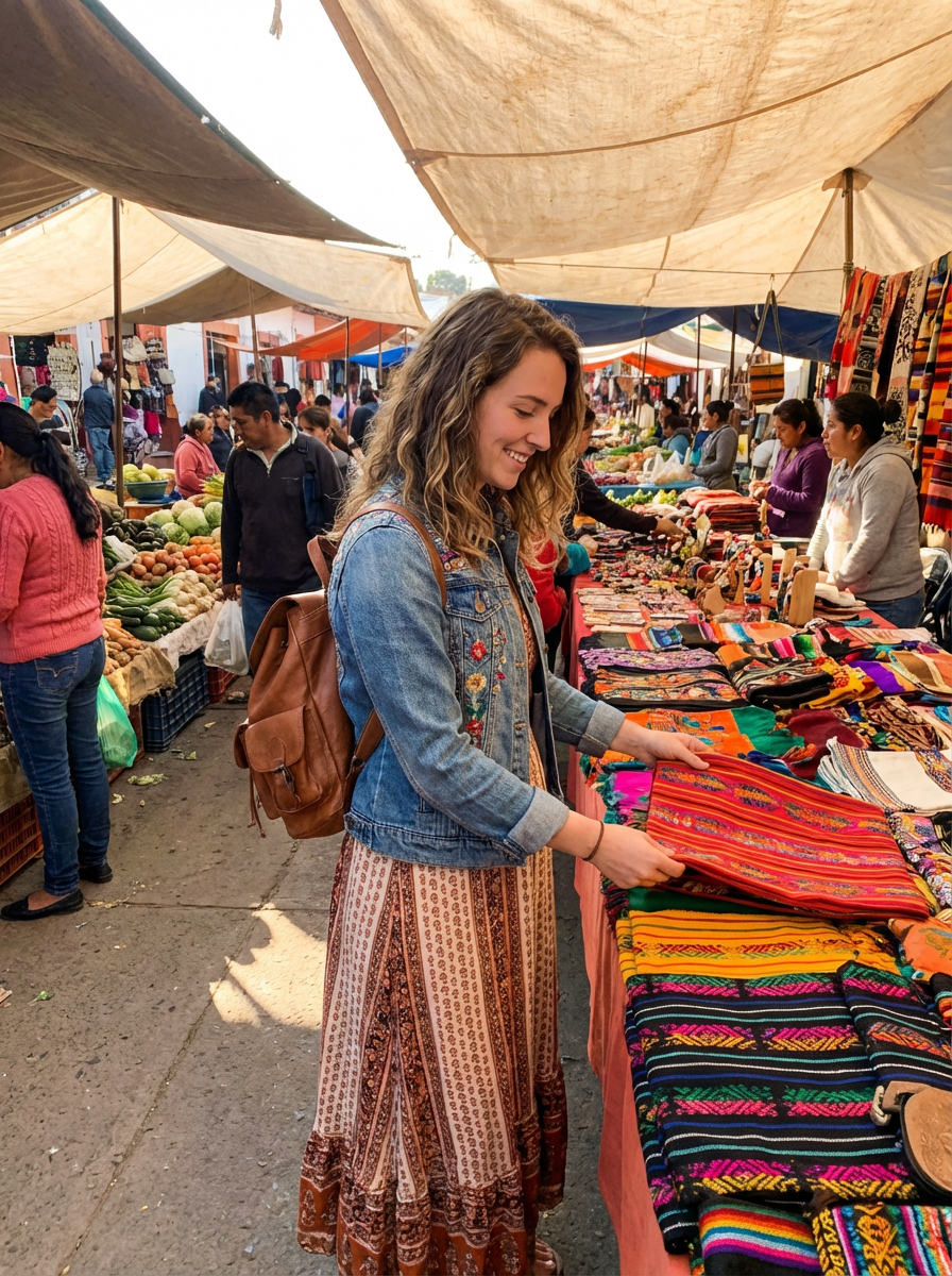 wanderlust feminine model browsing stalls in a bustling local market