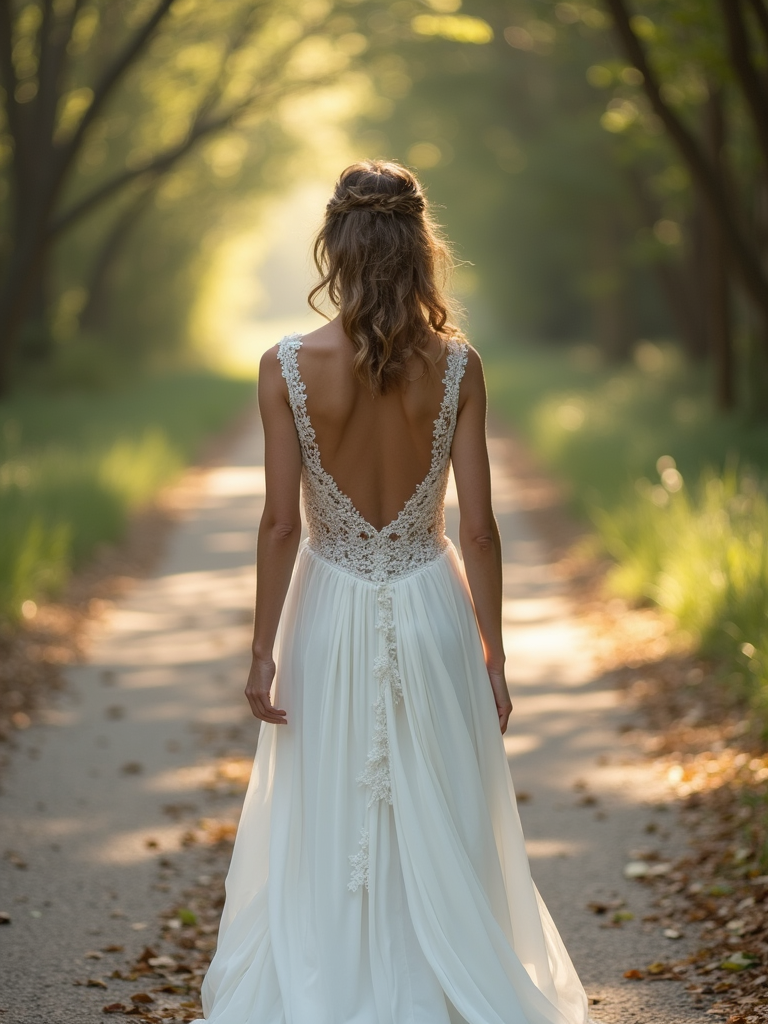 Wedding day candid moment, walking down a scenic path. Model wearing a flowing white gown with delicate embroidery . Sunlight filtering through trees, cinematic photography.