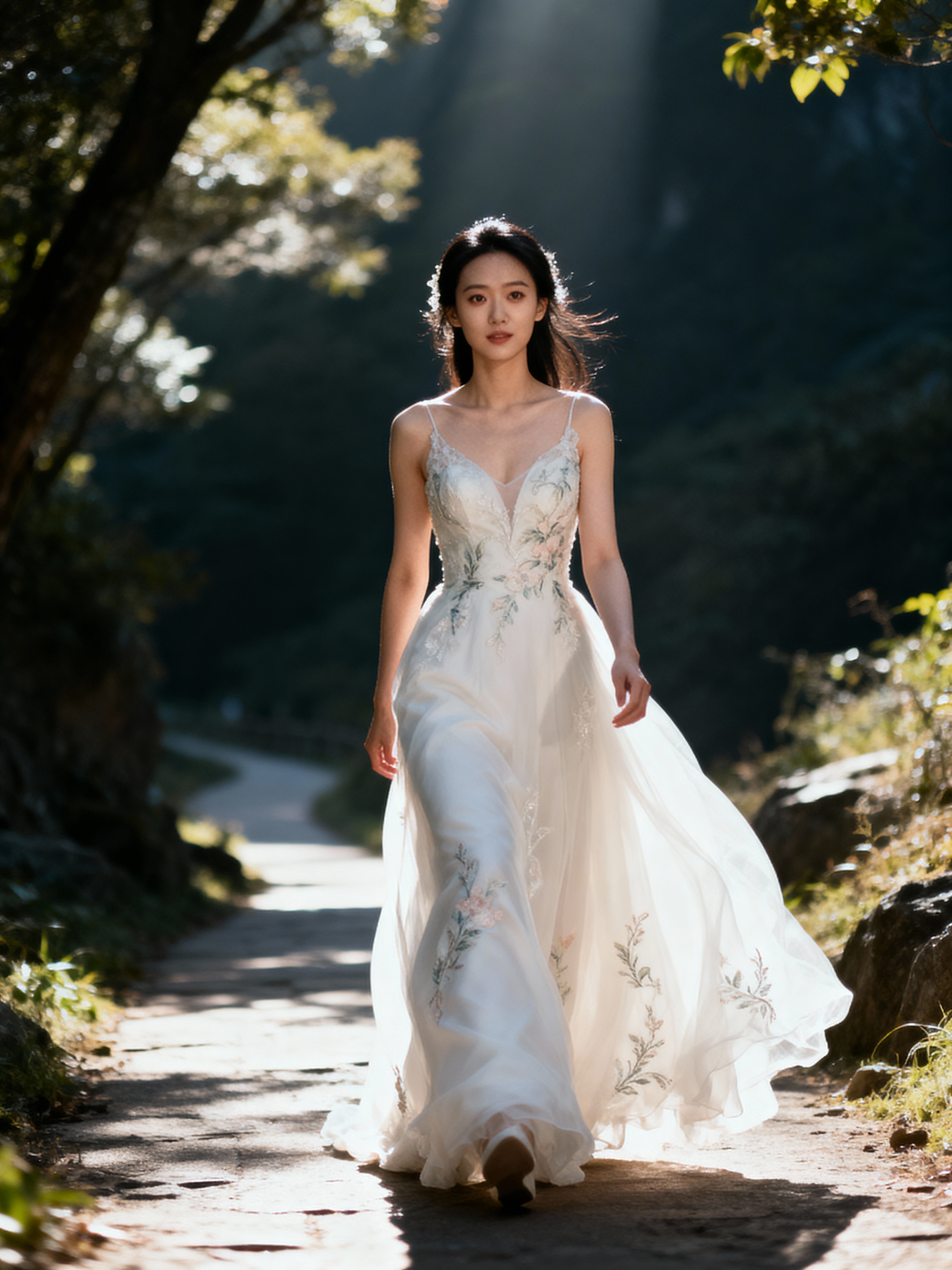 Wedding day candid moment, walking down a scenic path. Model wearing a flowing white gown with delicate embroidery . Sunlight filtering through trees, cinematic photography.