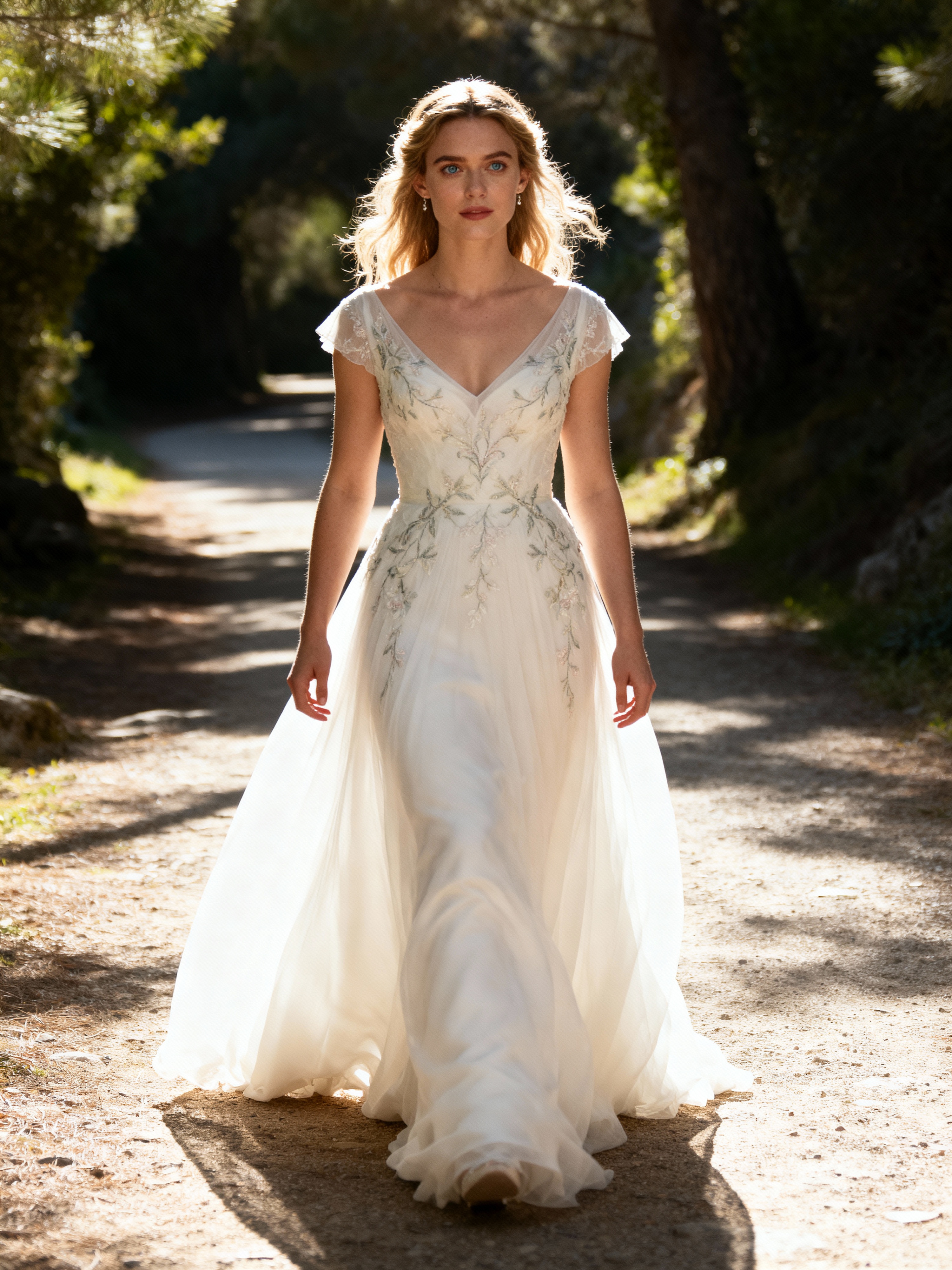 Wedding day candid moment, walking down a scenic path. Model wearing a flowing white gown with delicate embroidery . Sunlight filtering through trees, cinematic photography.