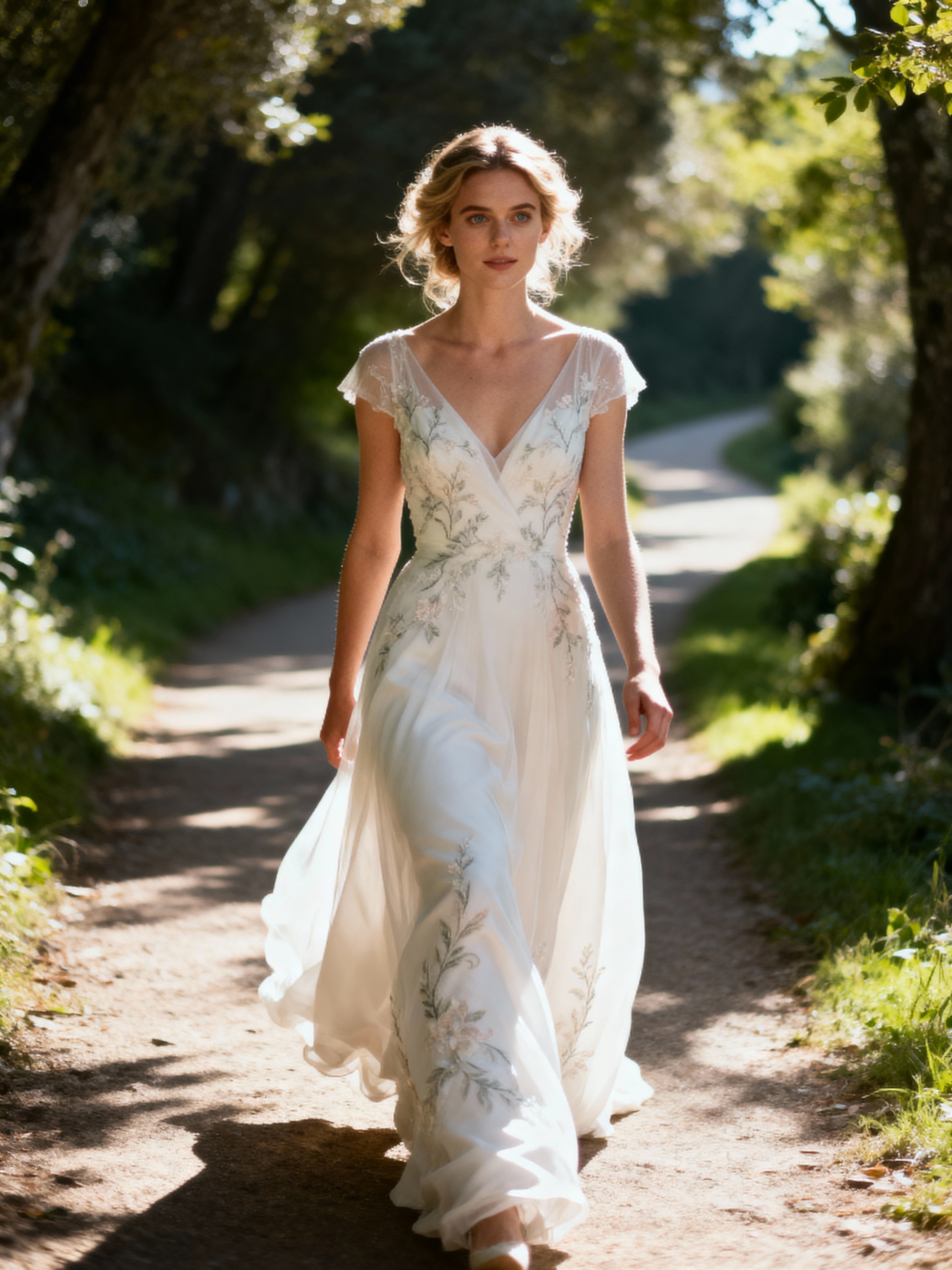 Wedding day candid moment, walking down a scenic path. Model wearing a flowing white gown with delicate embroidery . Sunlight filtering through trees, cinematic photography.