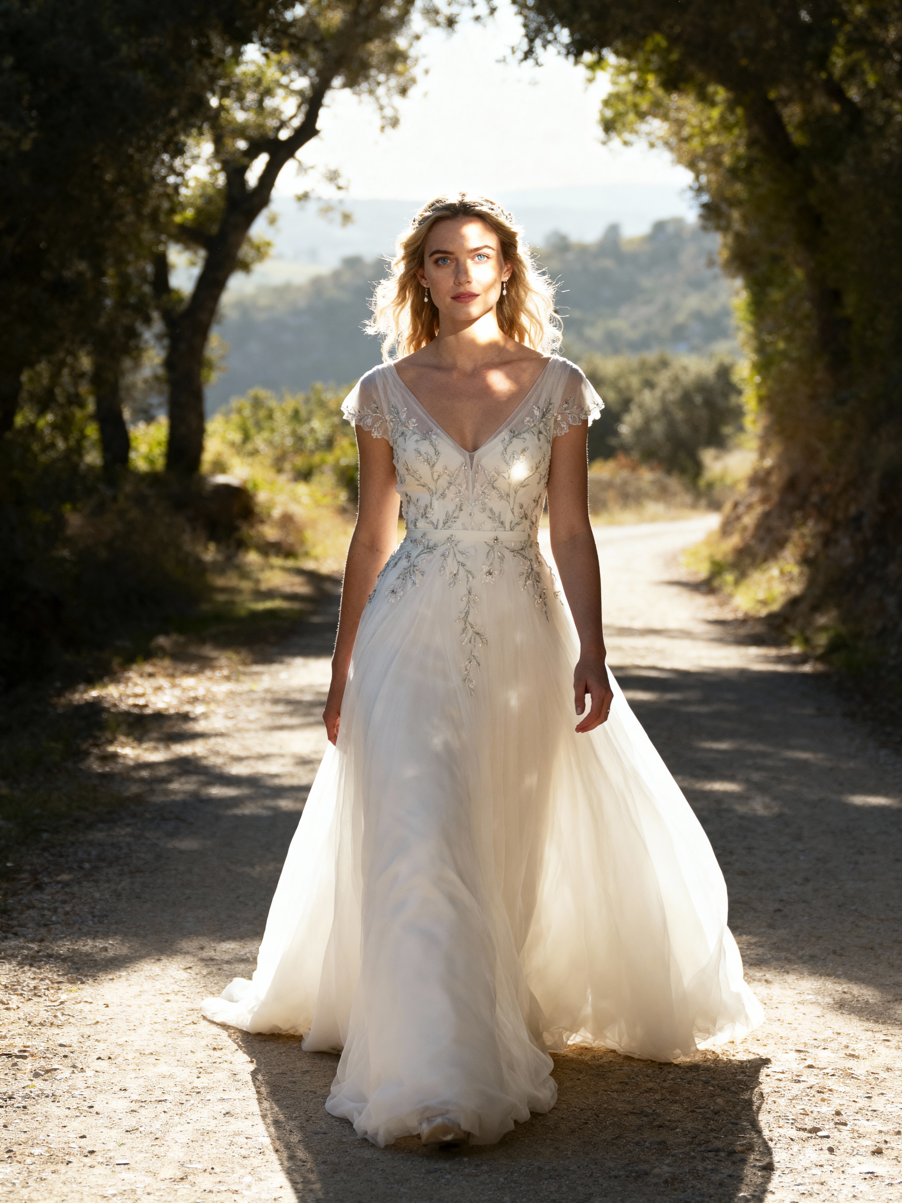 Wedding day candid moment, walking down a scenic path. Model wearing a flowing white gown with delicate embroidery . Sunlight filtering through trees, cinematic photography.