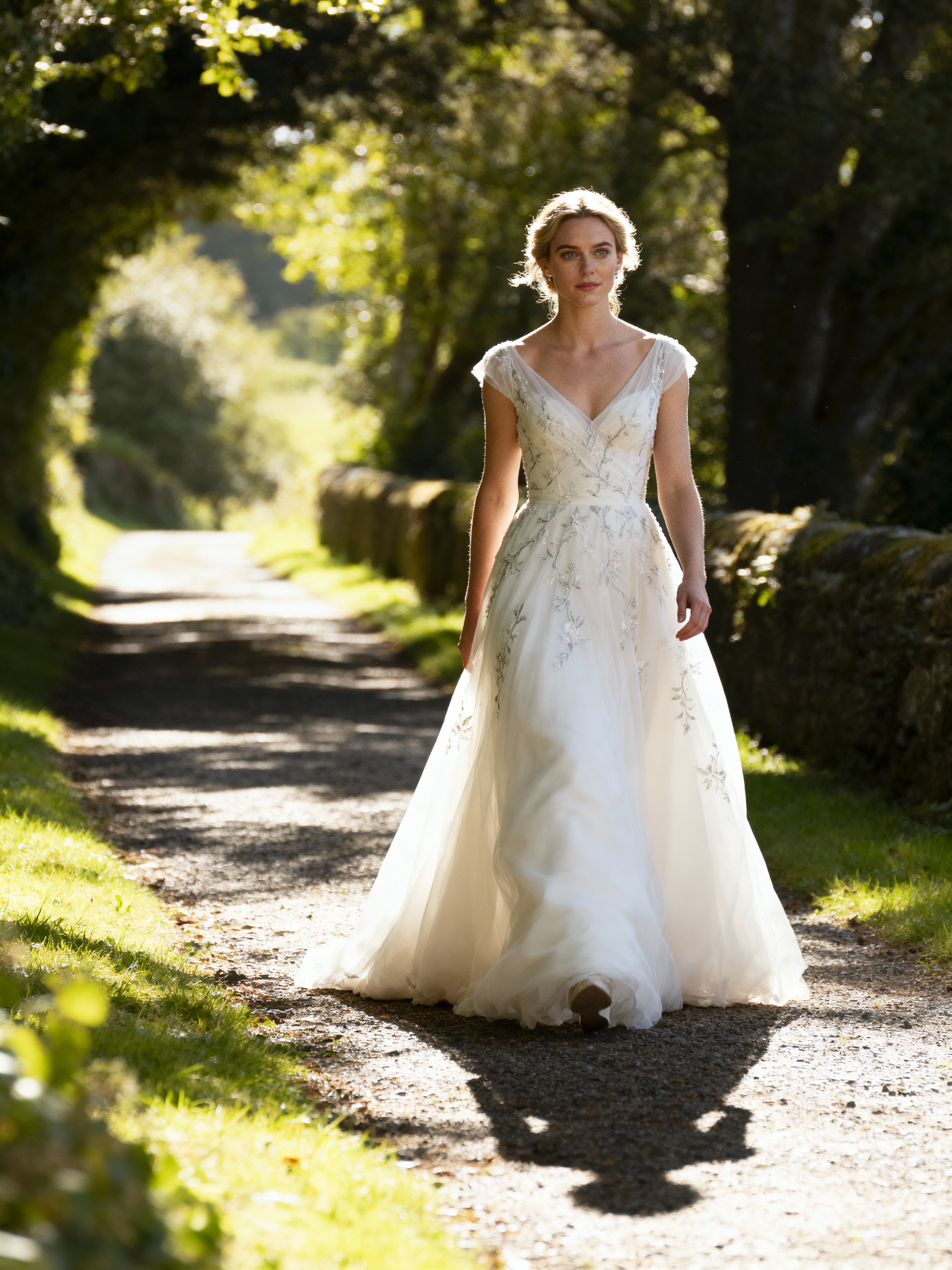 Wedding day candid moment, walking down a scenic path. Model wearing a flowing white gown with delicate embroidery . Sunlight filtering through trees, cinematic photography.