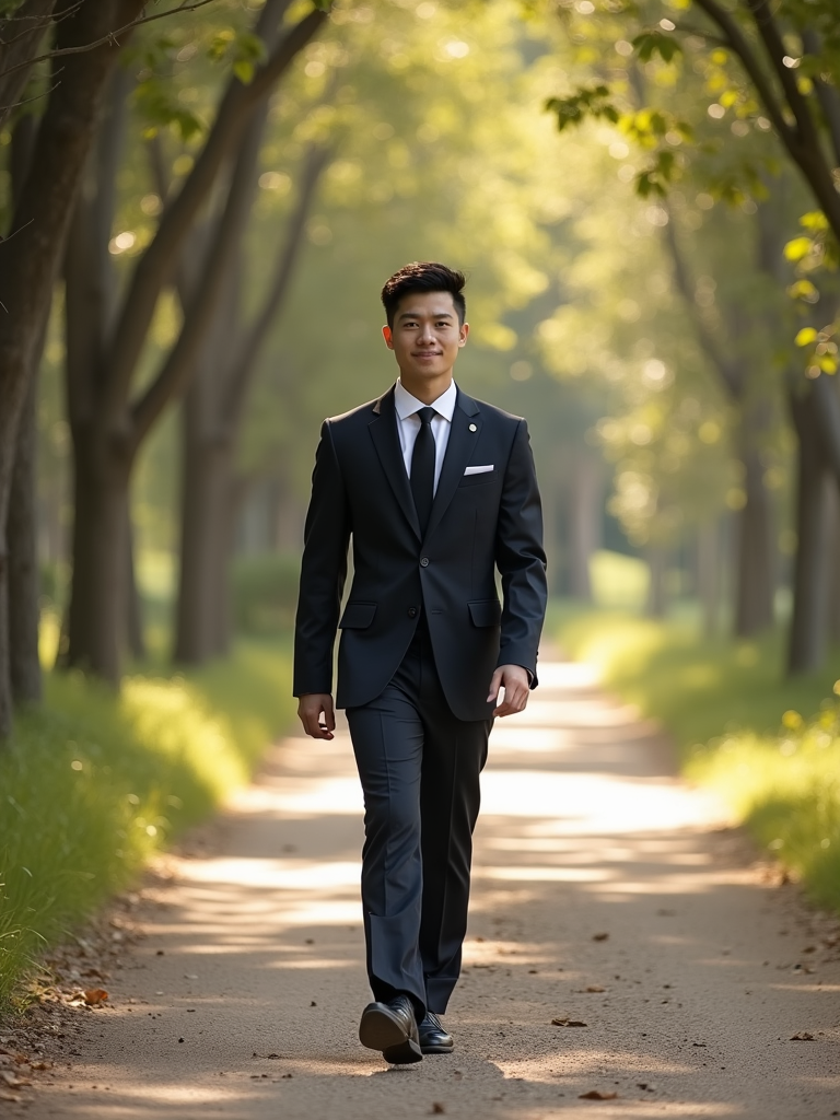Wedding day candid moment, walking down a scenic path. Model wearing a sharp modern suit, confident stride . Sunlight filtering through trees, cinematic photography.