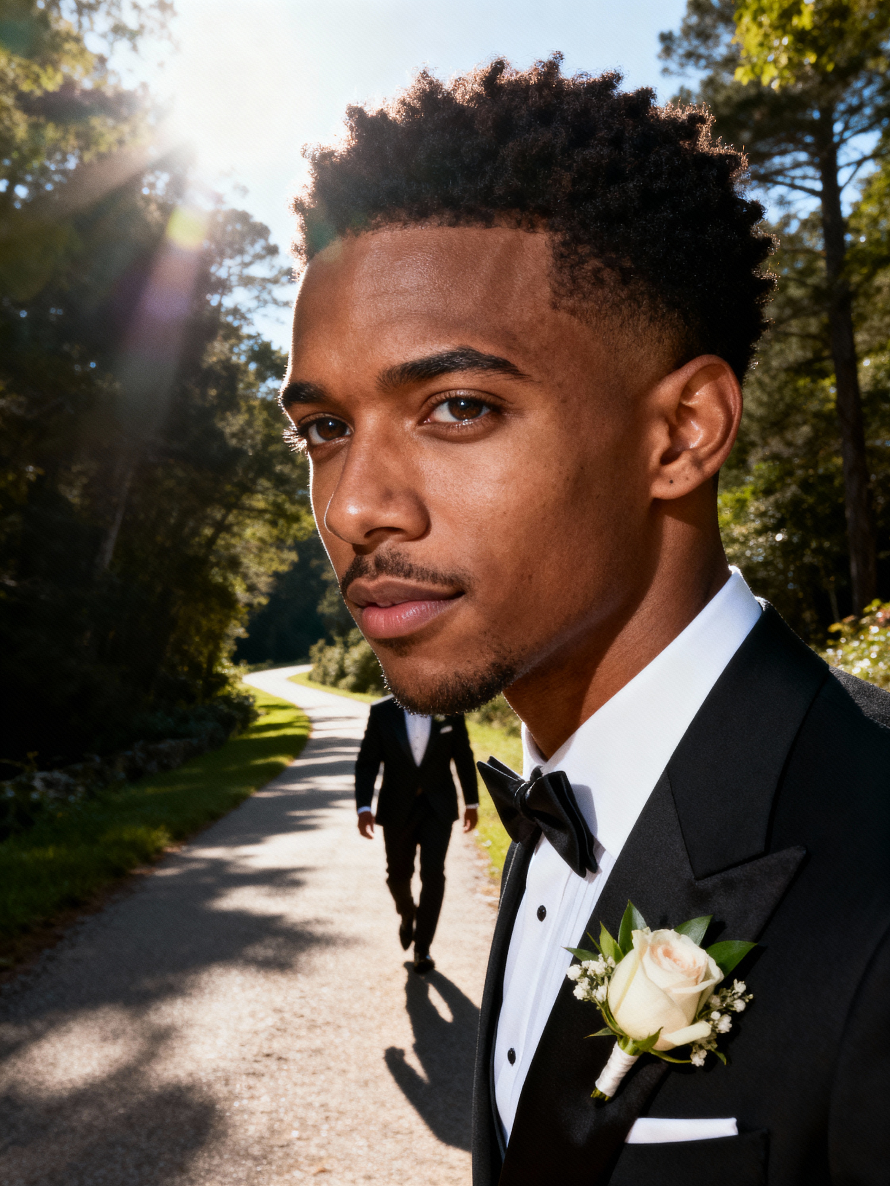 Wedding day candid moment, walking down a scenic path. Model wearing a sharp modern suit with boutonnière, confident stride . Sunlight filtering through trees, cinematic photography.
