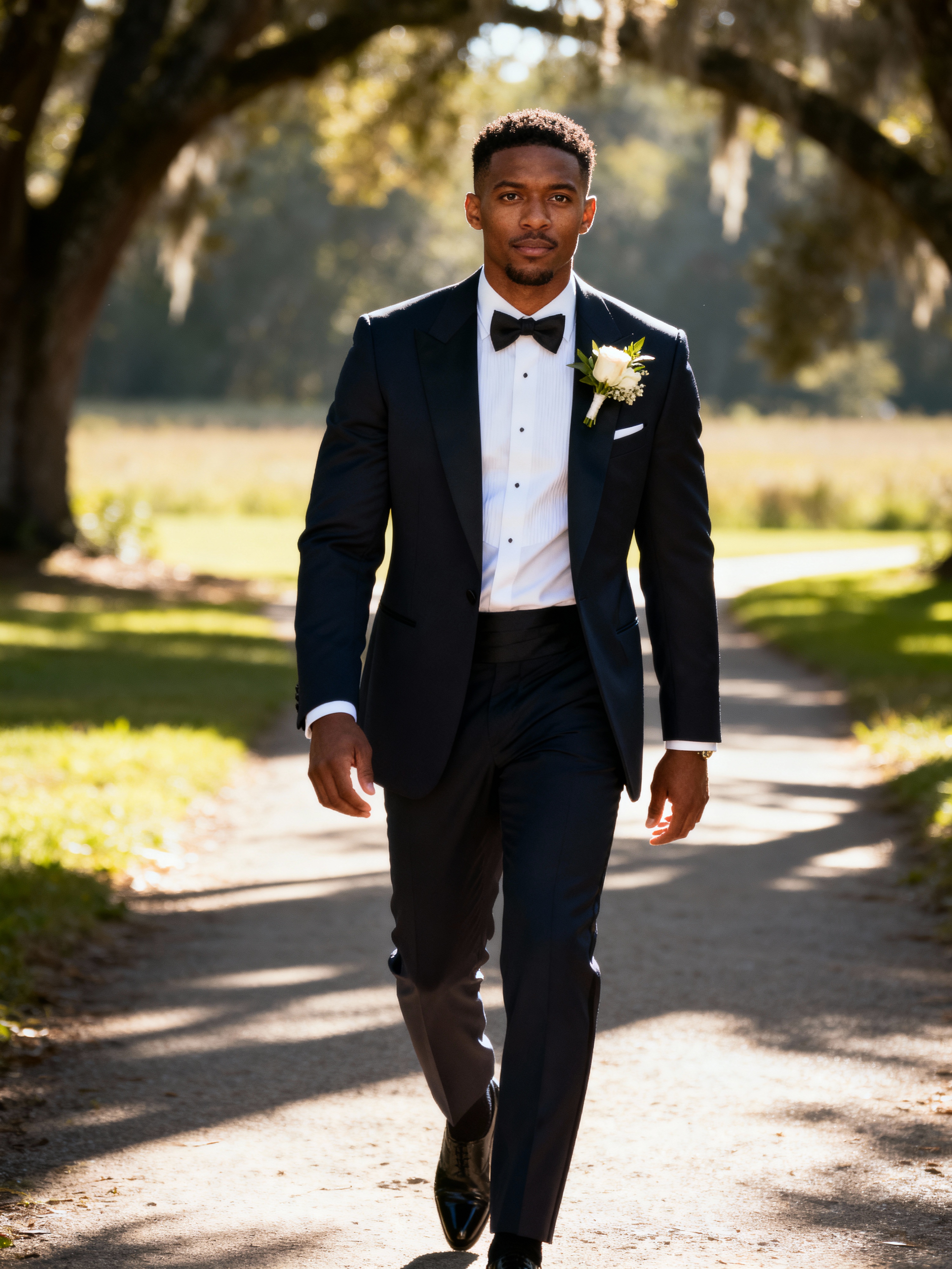 Wedding day candid moment, walking down a scenic path. Model wearing a sharp modern suit with boutonnière, confident stride . Sunlight filtering through trees, cinematic photography.