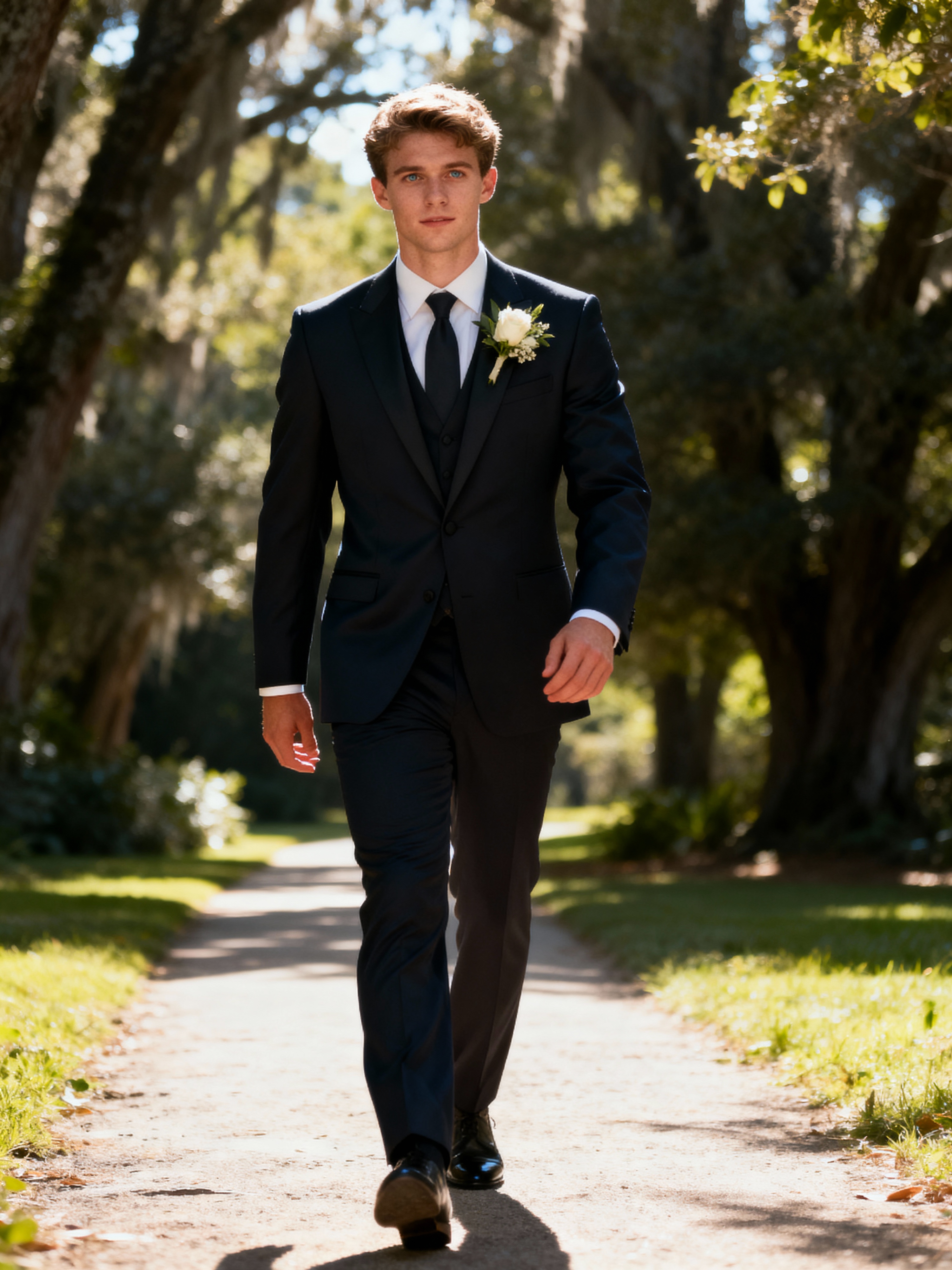 Wedding day candid moment, walking down a scenic path. Model wearing a sharp modern suit with boutonnière, confident stride . Sunlight filtering through trees, cinematic photography.