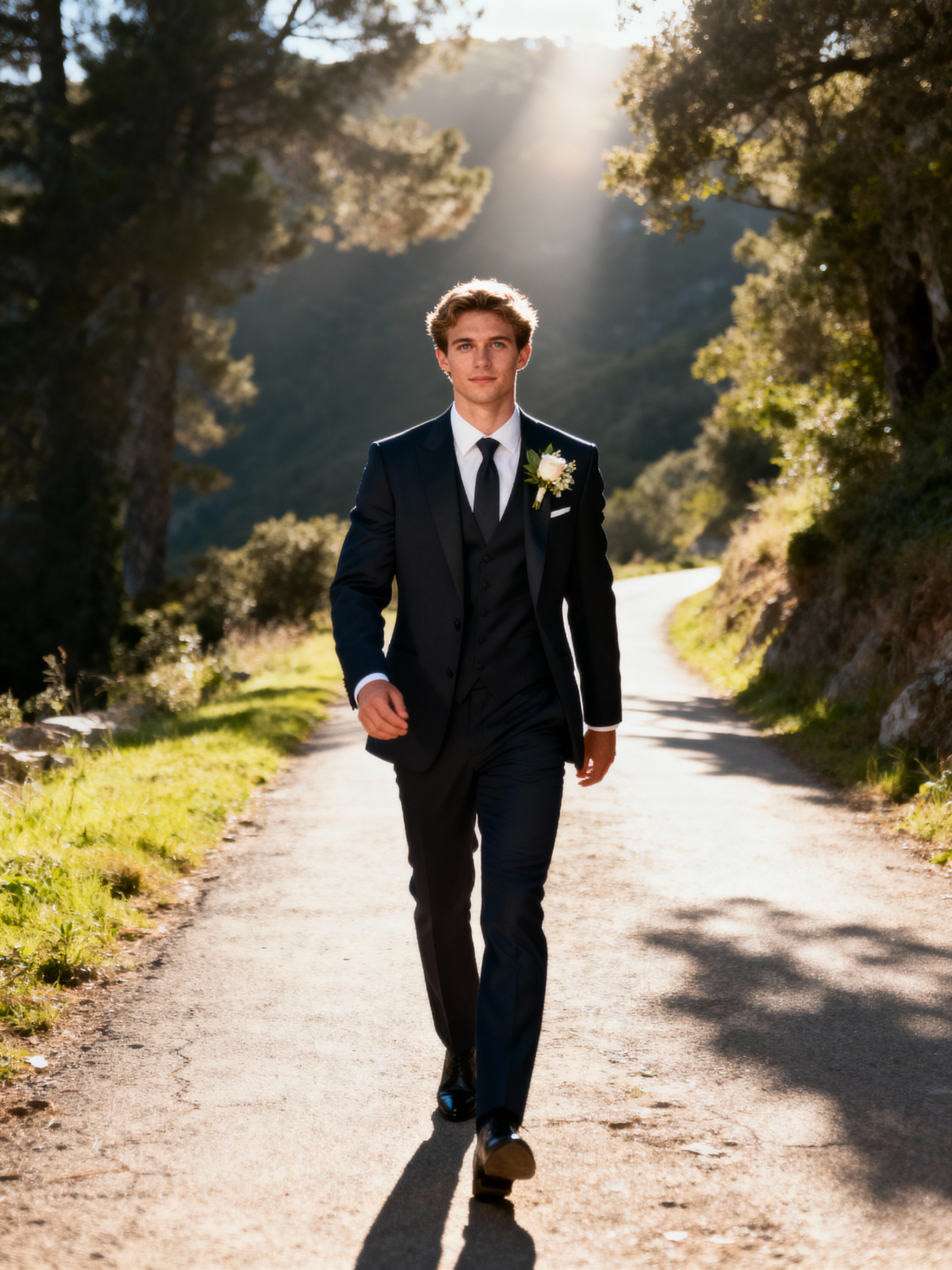 Wedding day candid moment, walking down a scenic path. Model wearing a sharp modern suit with boutonnière, confident stride . Sunlight filtering through trees, cinematic photography.