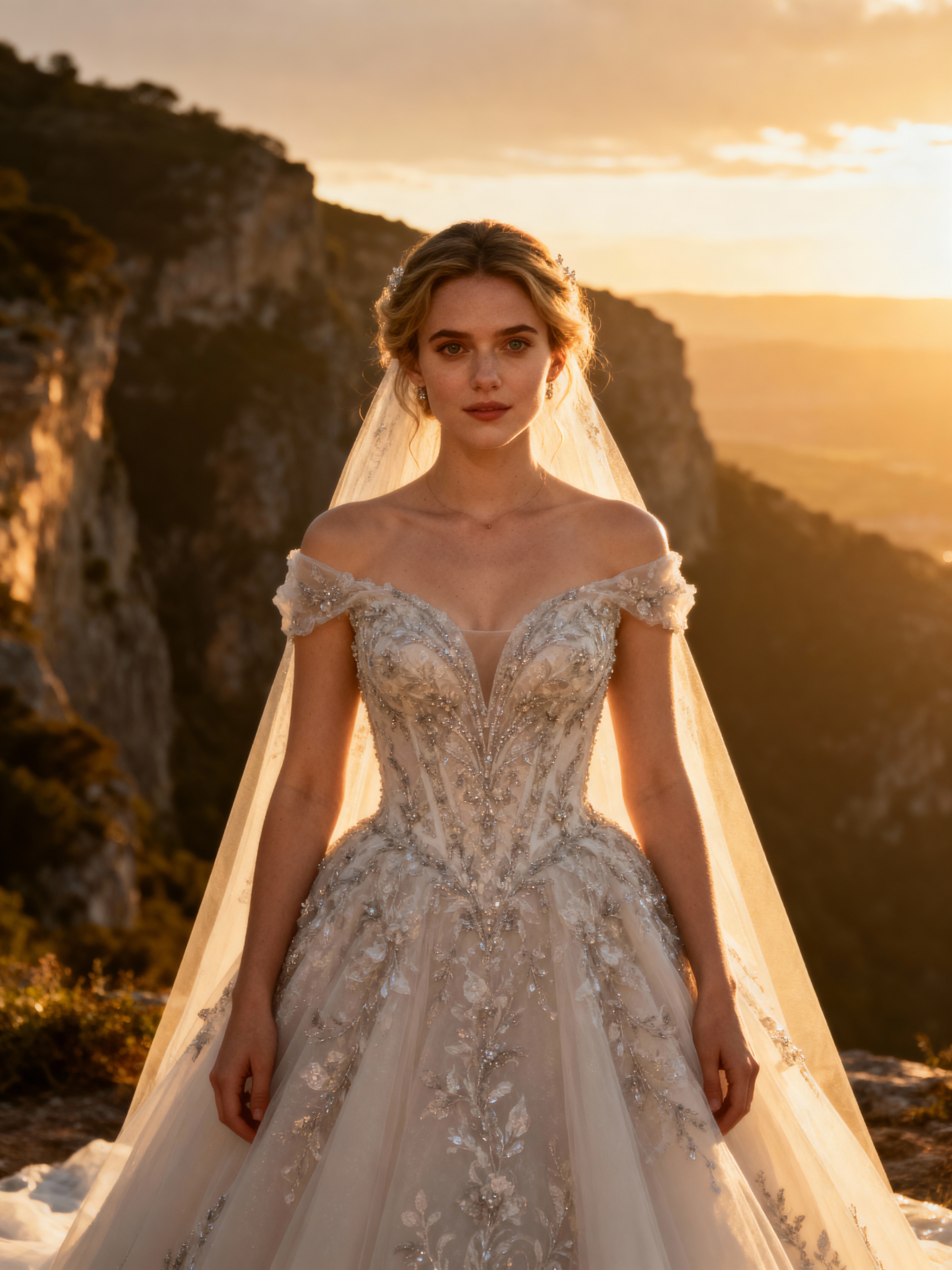 Wedding photoshoot in a breathtaking location. Model wearing a stunning wedding dress . Soft golden hour lighting, romantic atmosphere.