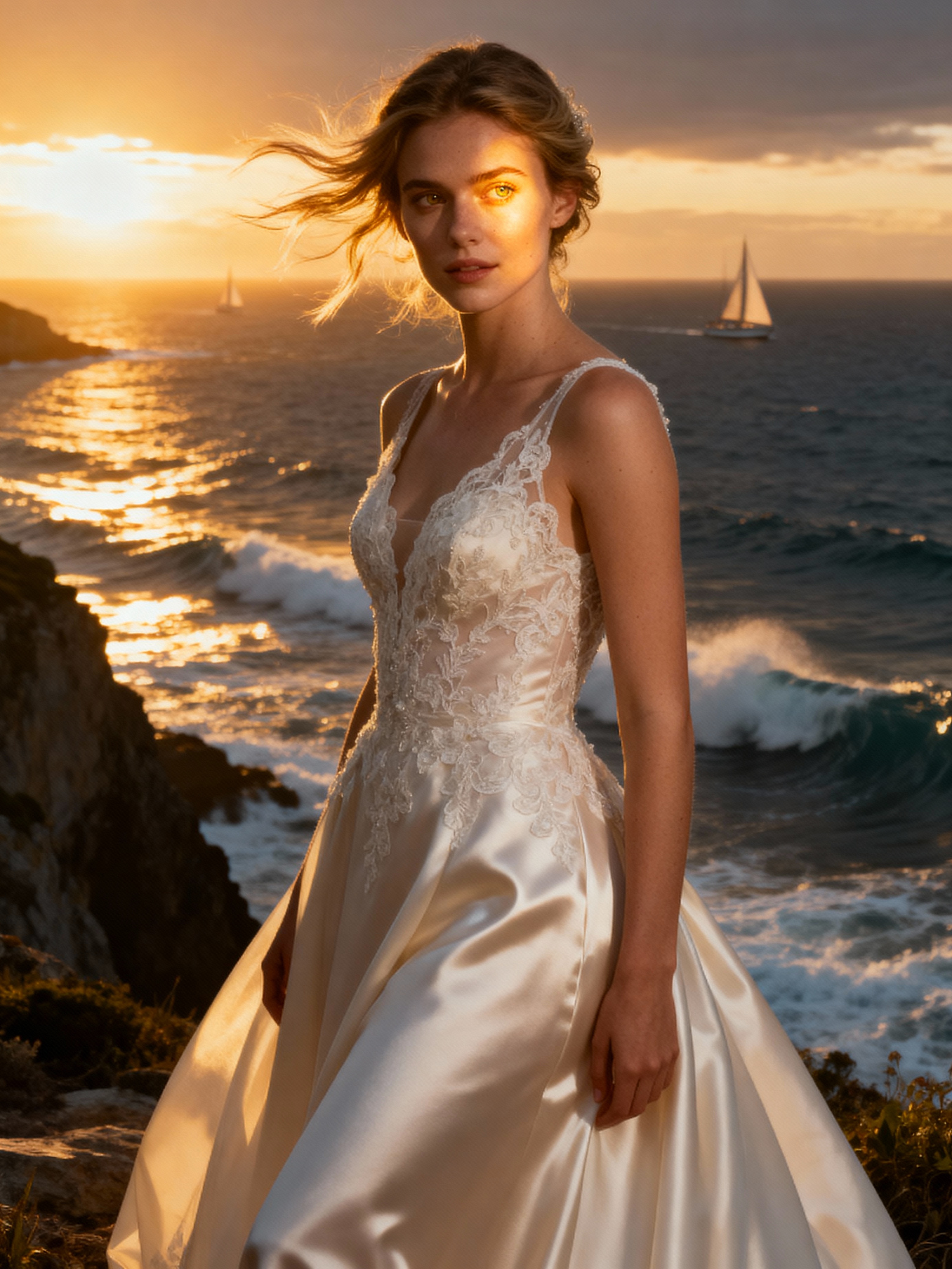 Wedding photoshoot in a breathtaking location. Model wearing a stunning wedding dress . Soft golden hour lighting, romantic atmosphere.