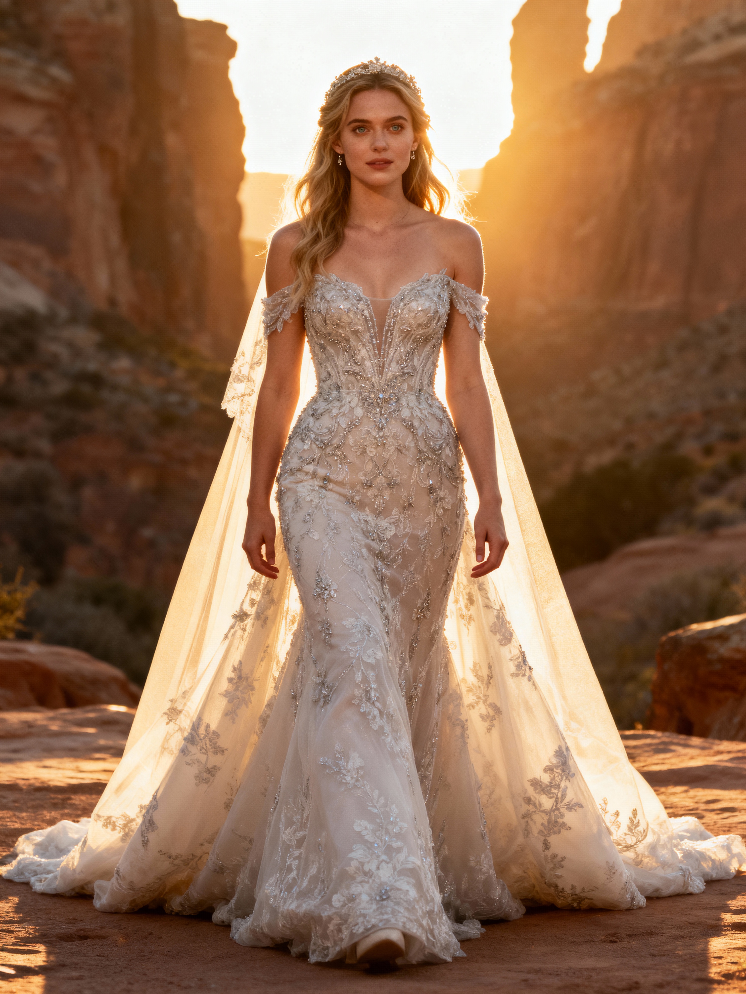 Wedding photoshoot in a breathtaking location. Model wearing a stunning wedding dress . Soft golden hour lighting, romantic atmosphere.