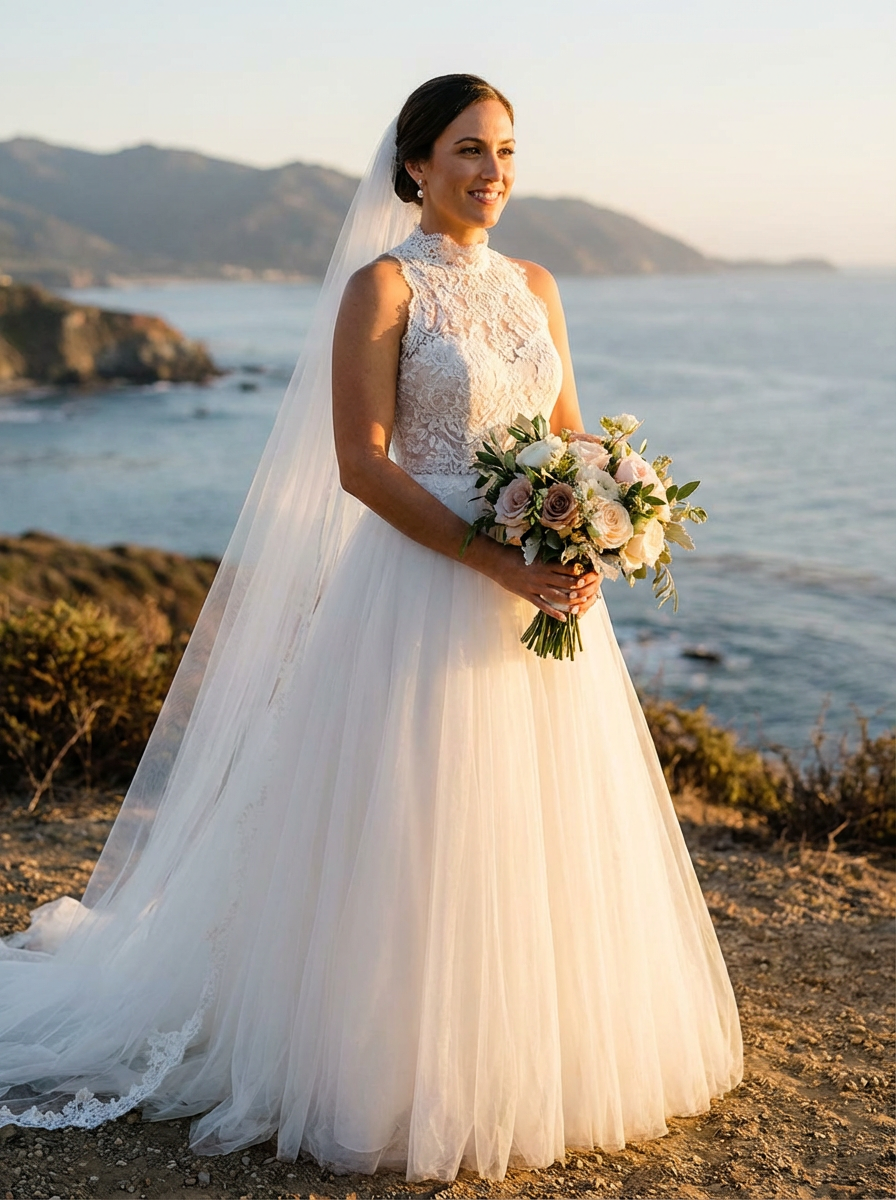 Wedding photoshoot in a breathtaking location. Model wearing a stunning wedding dress . Soft golden hour lighting, romantic atmosphere.