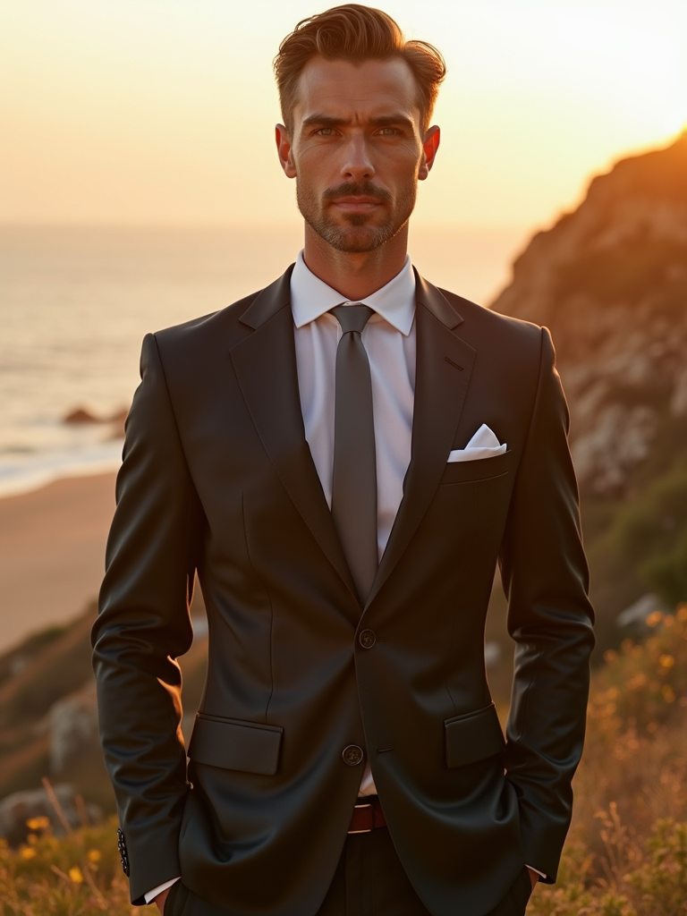 Wedding photoshoot in a breathtaking location. Model wearing a tailored wedding suit . Soft golden hour lighting, romantic atmosphere.