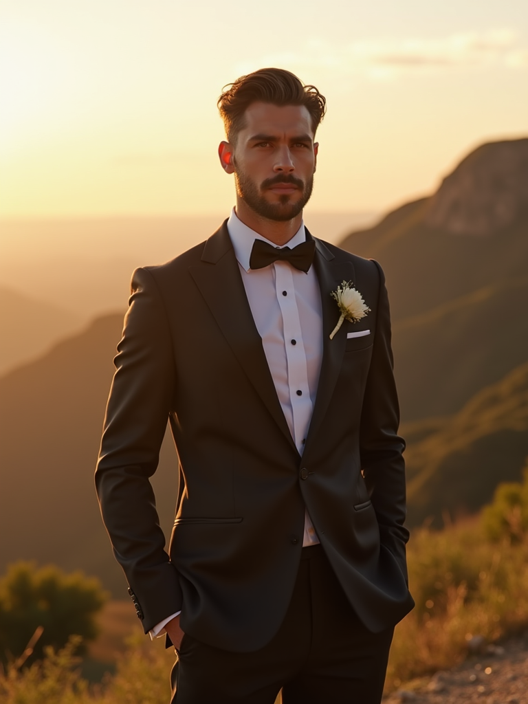 Wedding photoshoot in a breathtaking location. Model wearing a tailored wedding suit . Soft golden hour lighting, romantic atmosphere.