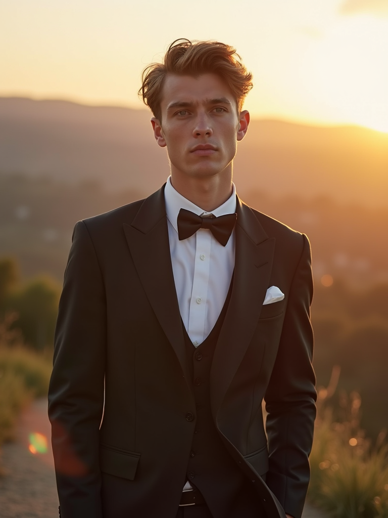Wedding photoshoot in a breathtaking location. Model wearing a tailored wedding suit . Soft golden hour lighting, romantic atmosphere.