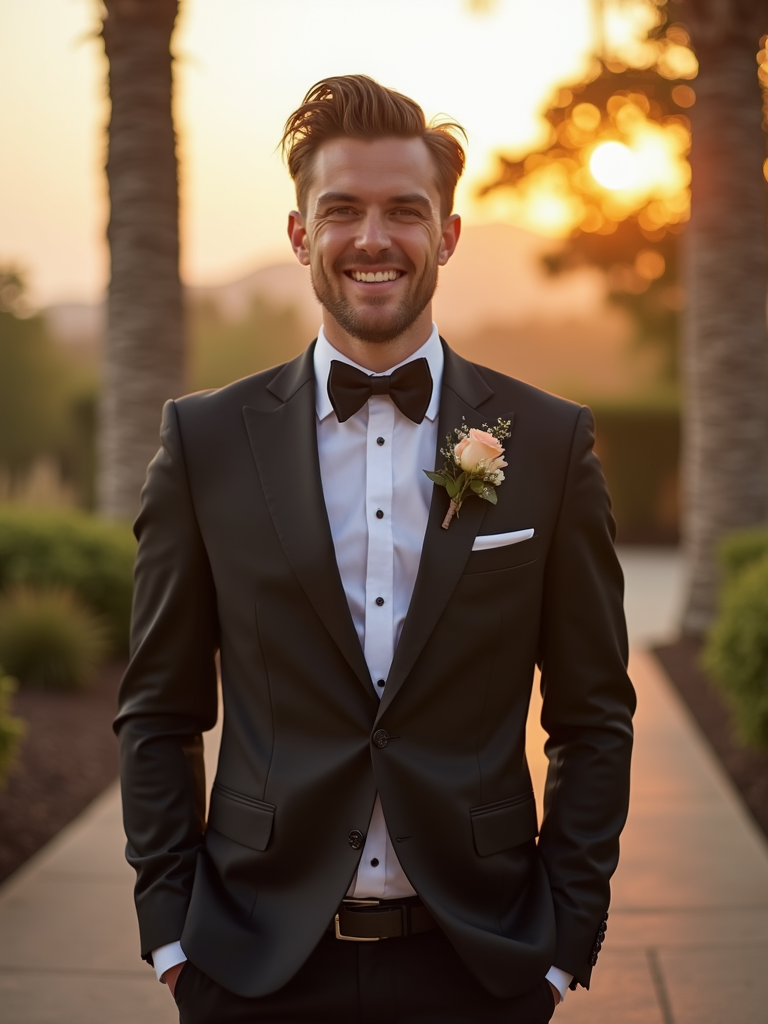 Wedding photoshoot in a breathtaking location. Model wearing a tailored wedding suit . Soft golden hour lighting, romantic atmosphere.