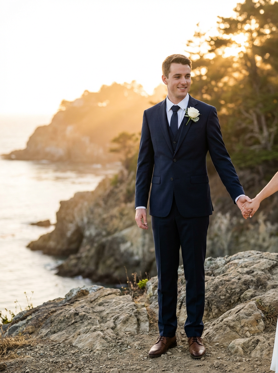Wedding photoshoot in a breathtaking location. Model wearing a tailored wedding suit with boutonnière . Soft golden hour lighting, romantic atmosphere.