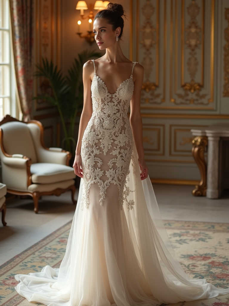 Wedding photoshoot in a luxurious ballroom setting. Model in an elegant pose with sophisticated wedding attire. Model wearing an embellished gown with intricate lace details .