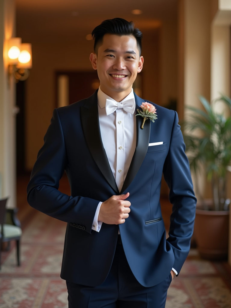 Wedding photoshoot in a luxurious ballroom setting. Model in an elegant pose with sophisticated wedding attire. Model wearing a navy blue tailored suit .