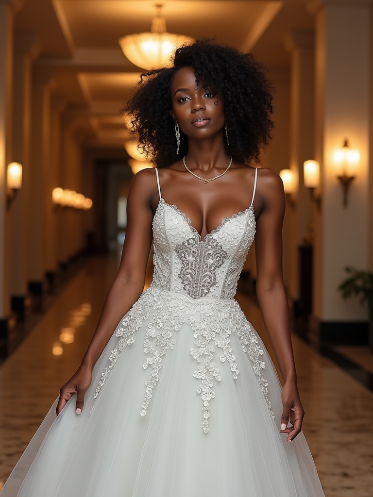 Wedding photoshoot in a luxurious ballroom setting. Model in an elegant pose with sophisticated wedding attire. Model wearing an embellished gown with intricate lace details .