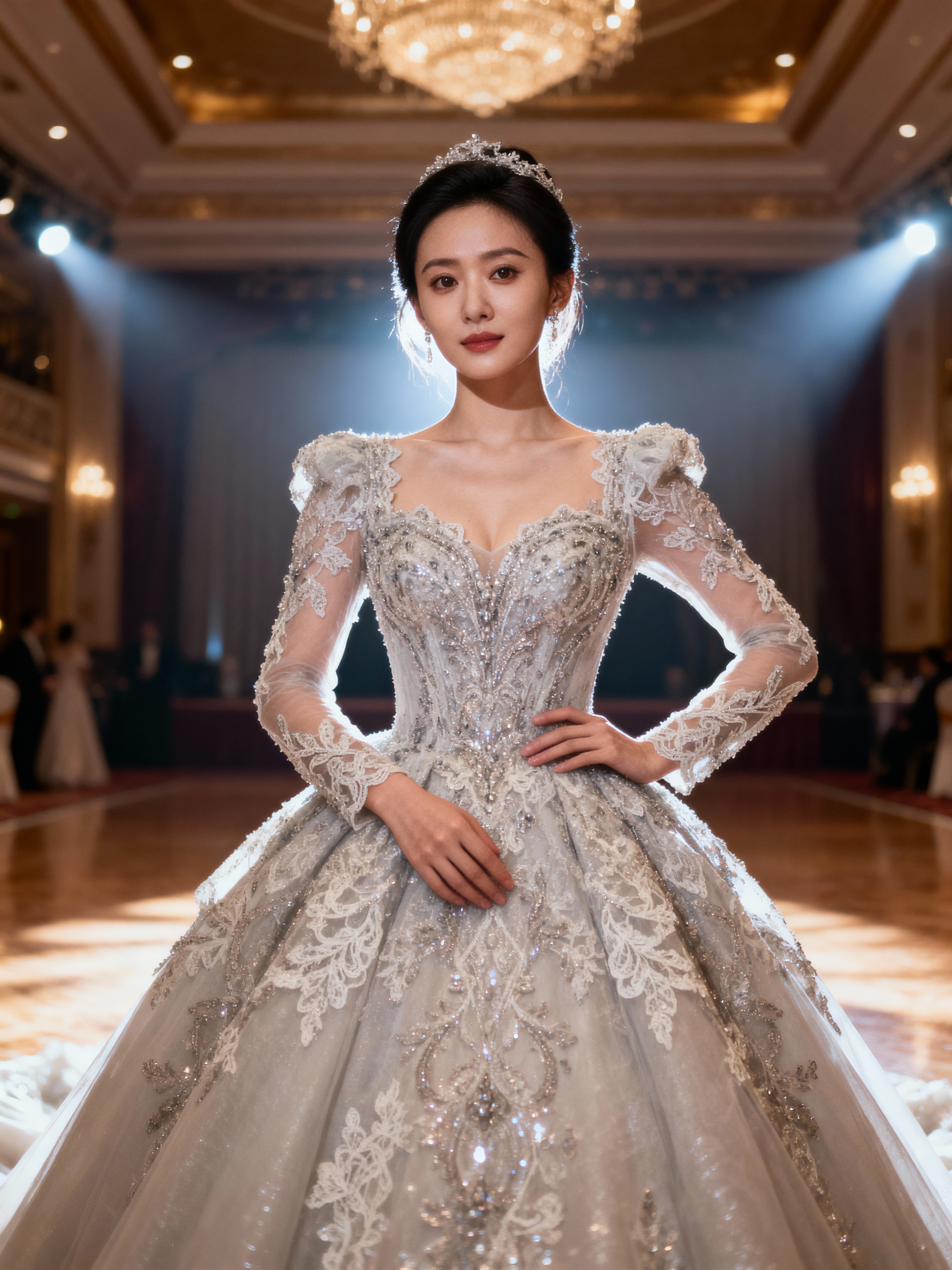 Wedding photoshoot in a luxurious ballroom setting. Model in an elegant pose with sophisticated wedding attire. Model wearing an embellished gown with intricate lace details .
