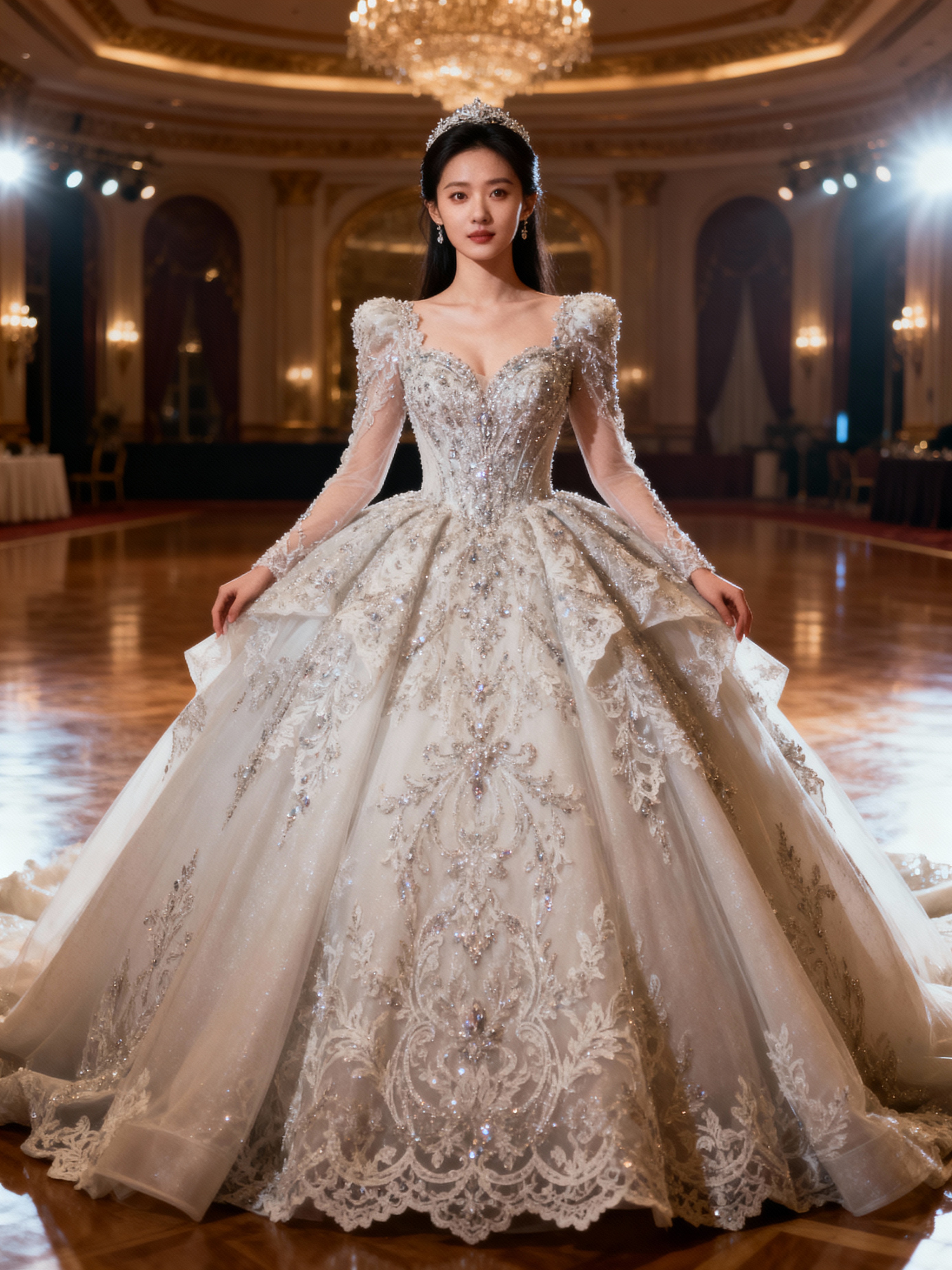Wedding photoshoot in a luxurious ballroom setting. Model in an elegant pose with sophisticated wedding attire. Model wearing an embellished gown with intricate lace details .