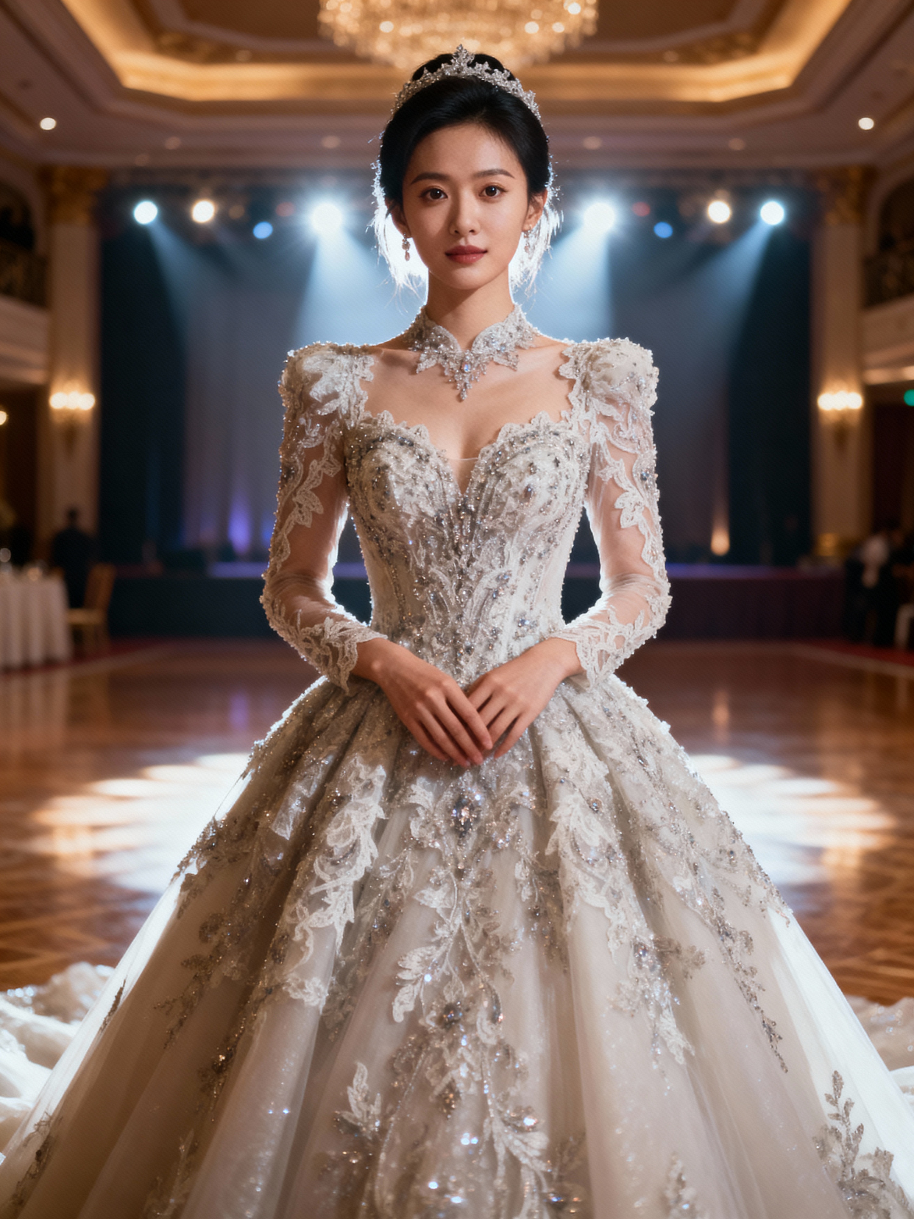 Wedding photoshoot in a luxurious ballroom setting. Model in an elegant pose with sophisticated wedding attire. Model wearing an embellished gown with intricate lace details .