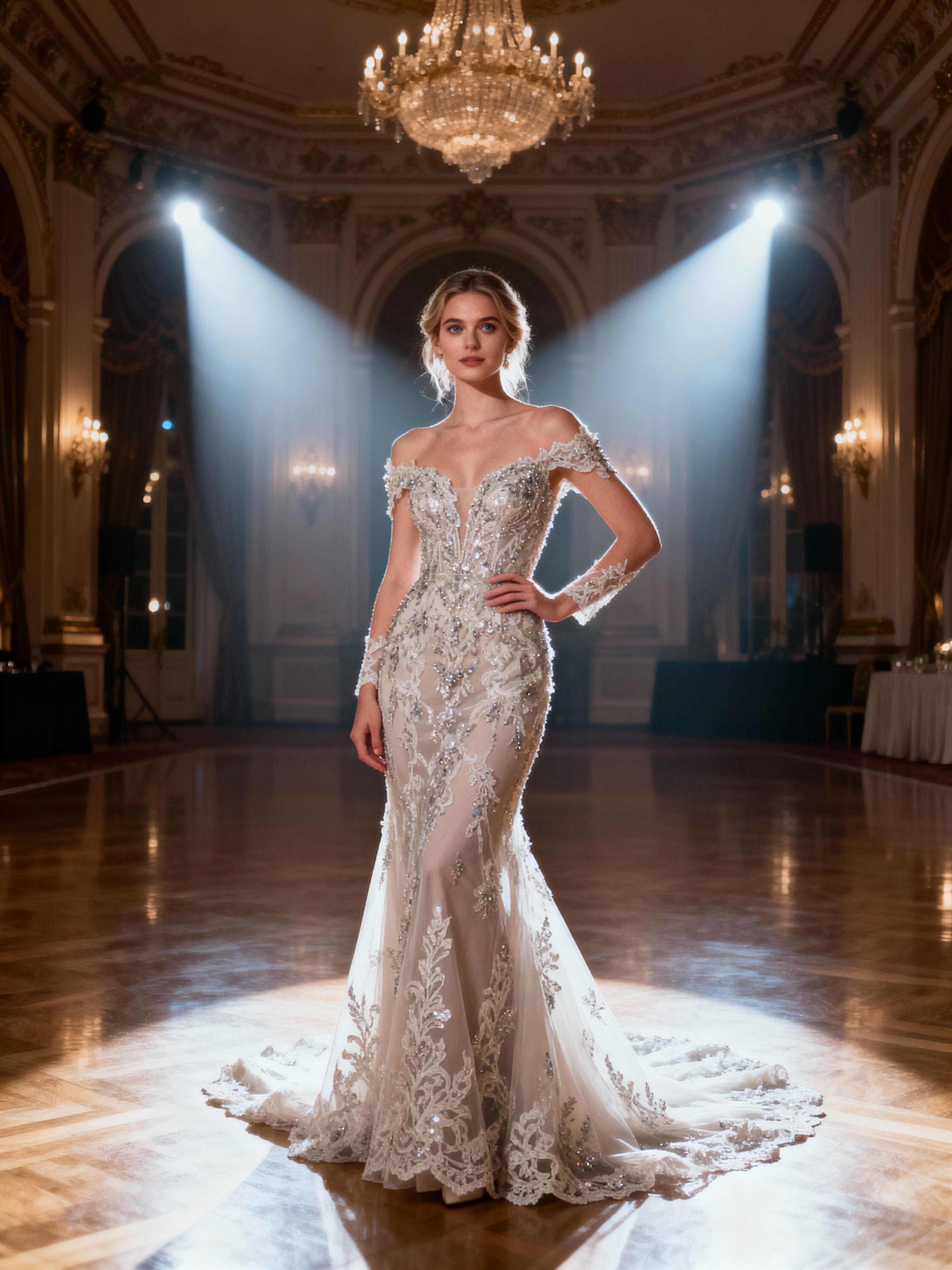 Wedding photoshoot in a luxurious ballroom setting. Model in an elegant pose with sophisticated wedding attire. Model wearing an embellished gown with intricate lace details .
