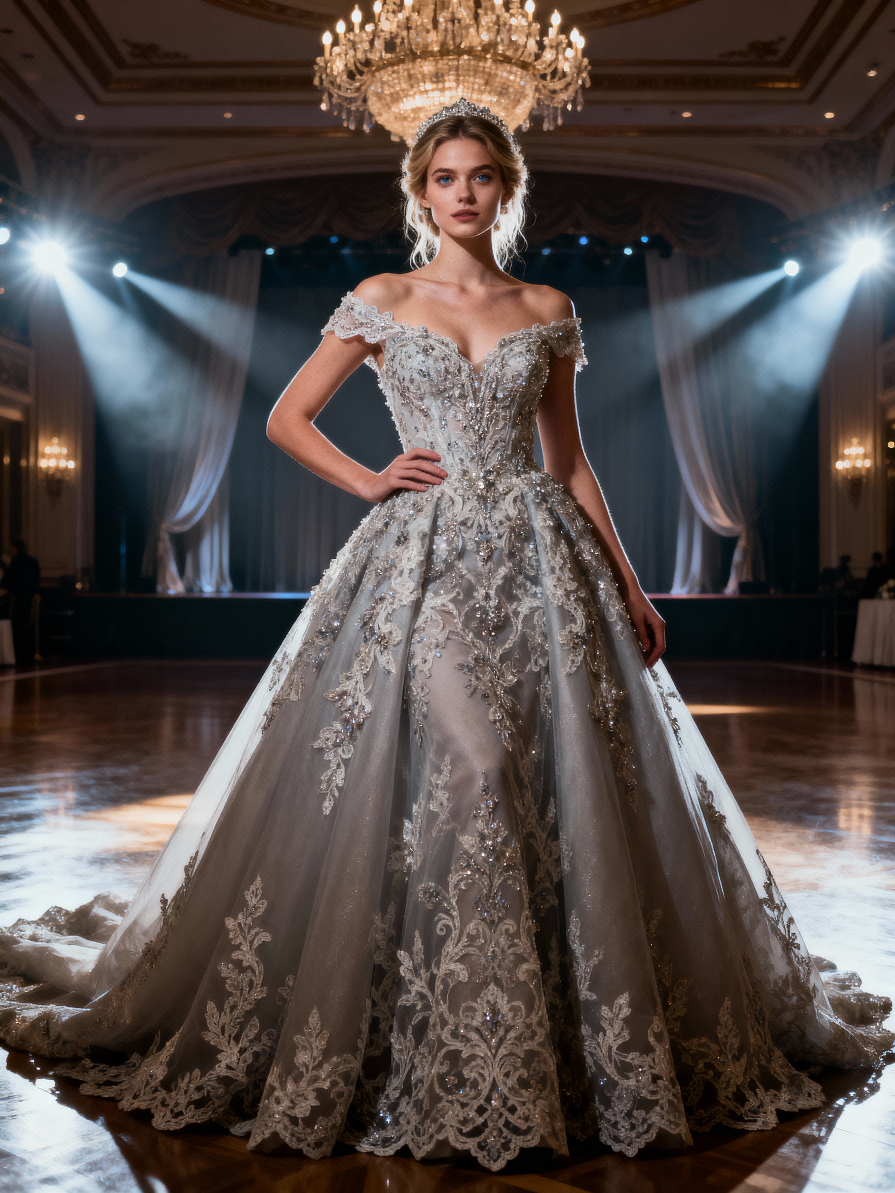 Wedding photoshoot in a luxurious ballroom setting. Model in an elegant pose with sophisticated wedding attire. Model wearing an embellished gown with intricate lace details .