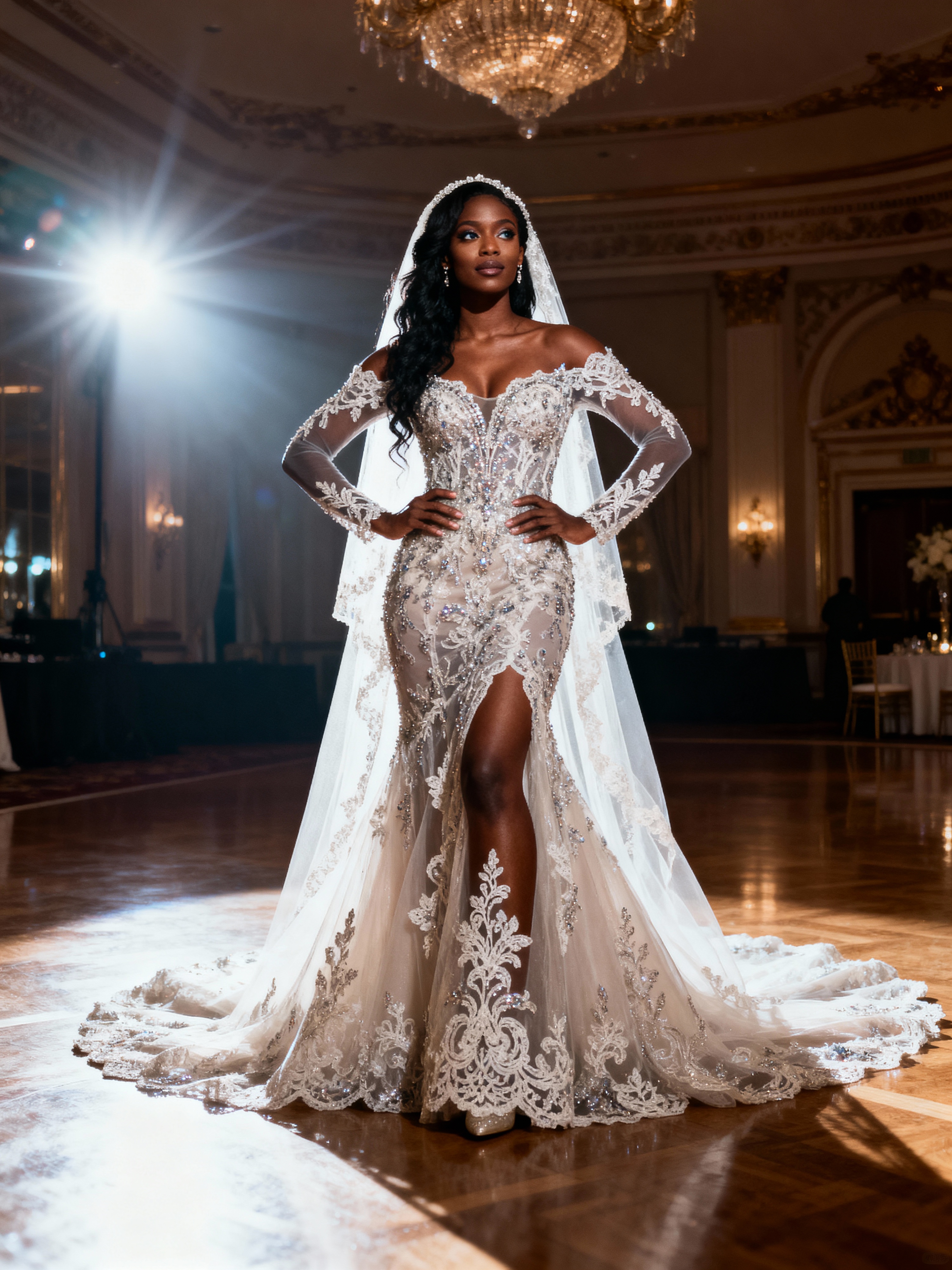 Wedding photoshoot in a luxurious ballroom setting. Model in an elegant pose with sophisticated wedding attire. Model wearing an embellished gown with intricate lace details .