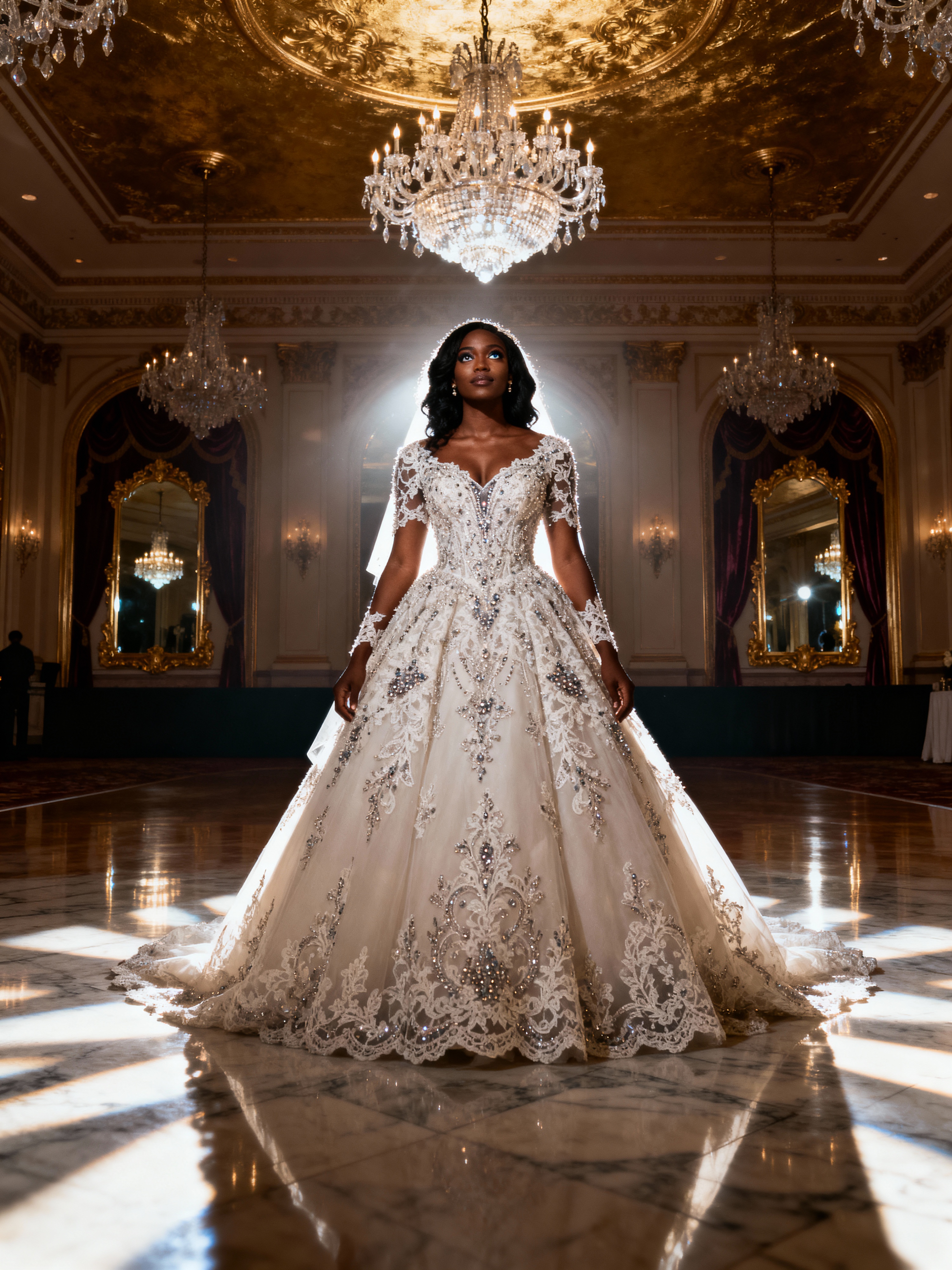 Wedding photoshoot in a luxurious ballroom setting. Model in an elegant pose with sophisticated wedding attire. Model wearing an embellished gown with intricate lace details .