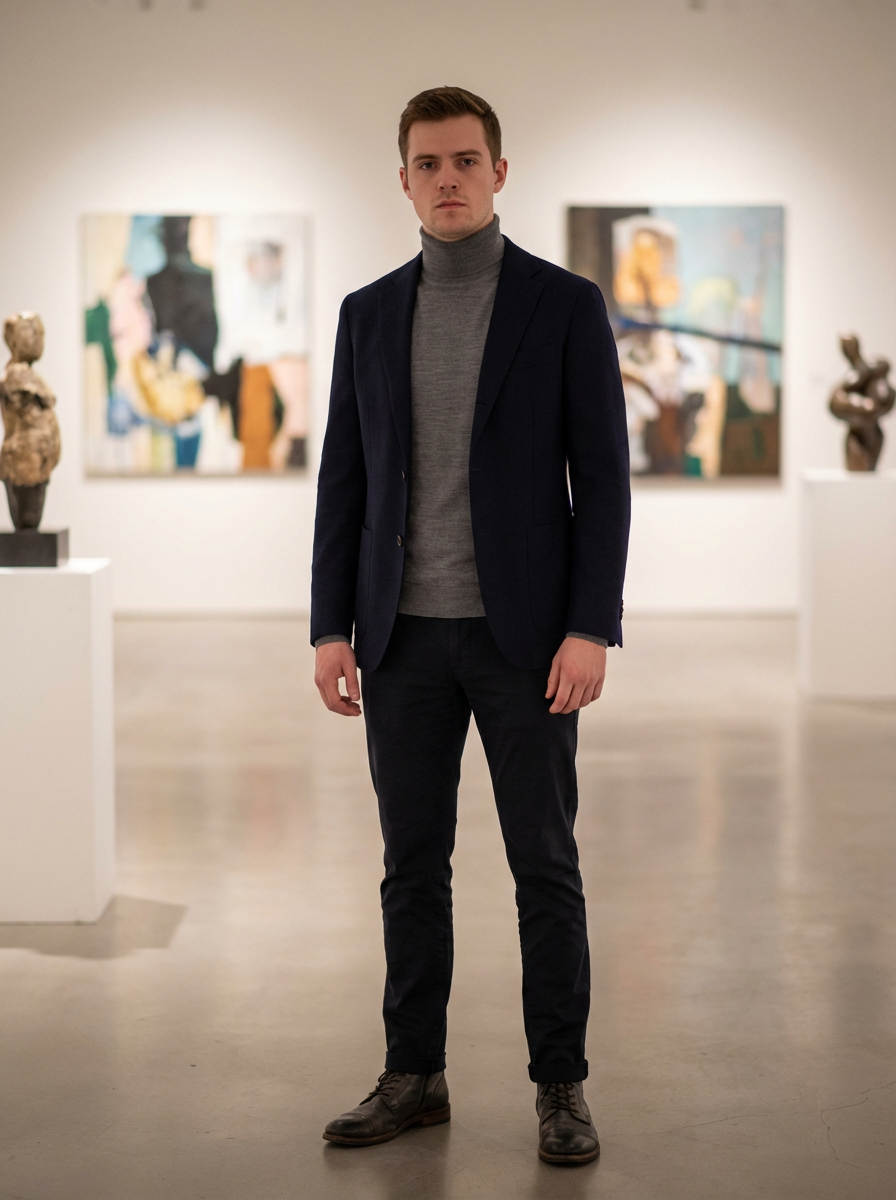 well-dressed model at art gallery, cultured sophisticated appearance, elegant casual outfit