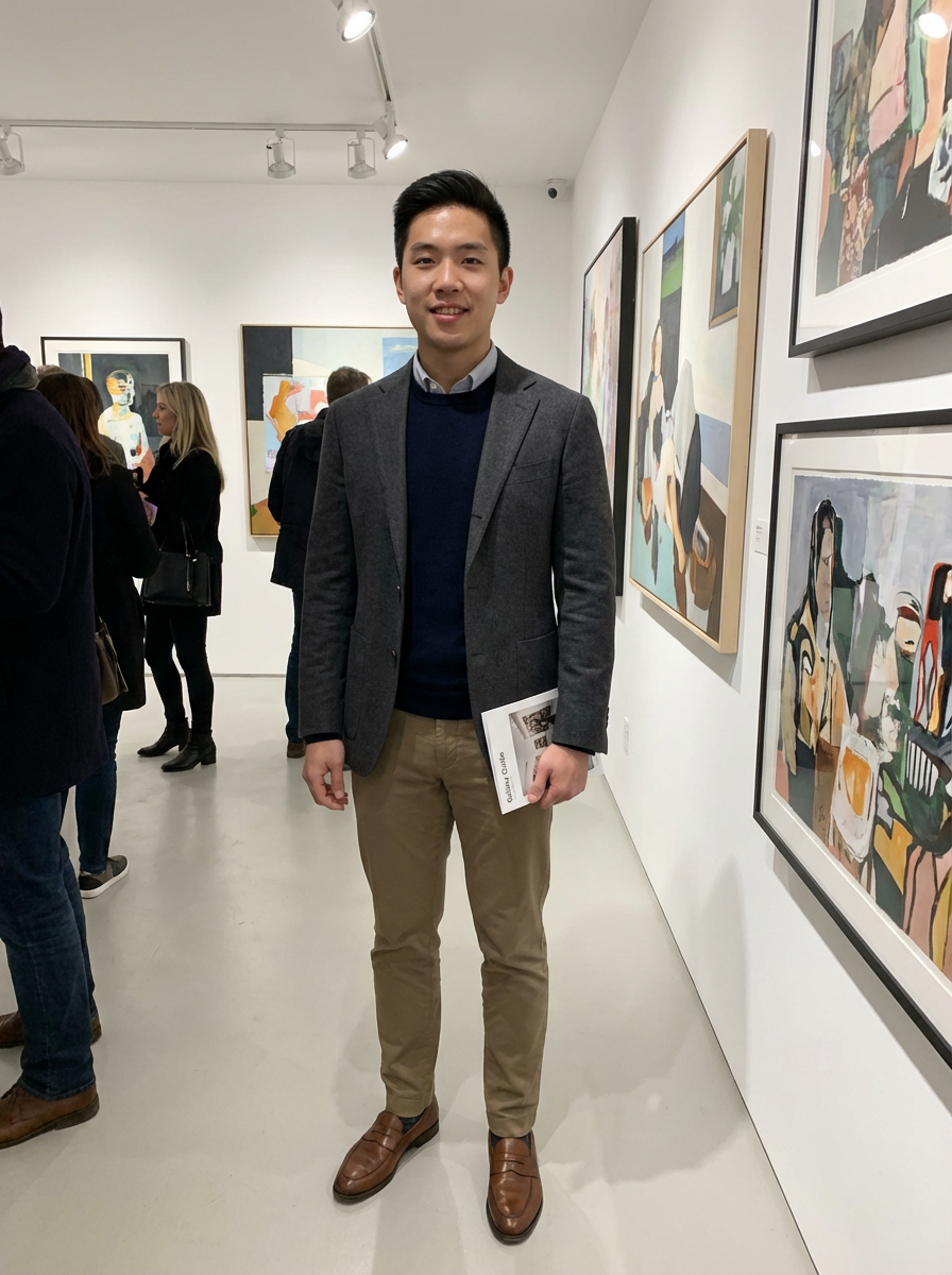 well-dressed model at art gallery, cultured sophisticated appearance, elegant casual outfit
