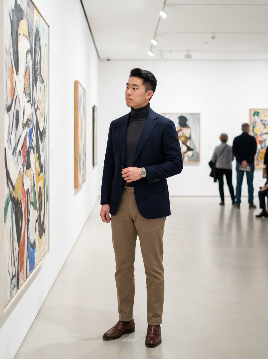 well-dressed model at art gallery, cultured sophisticated appearance, elegant casual outfit