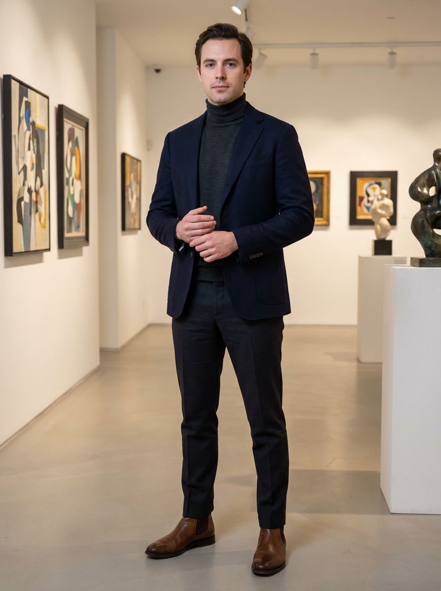 well-dressed model at art gallery, cultured sophisticated appearance, elegant casual outfit