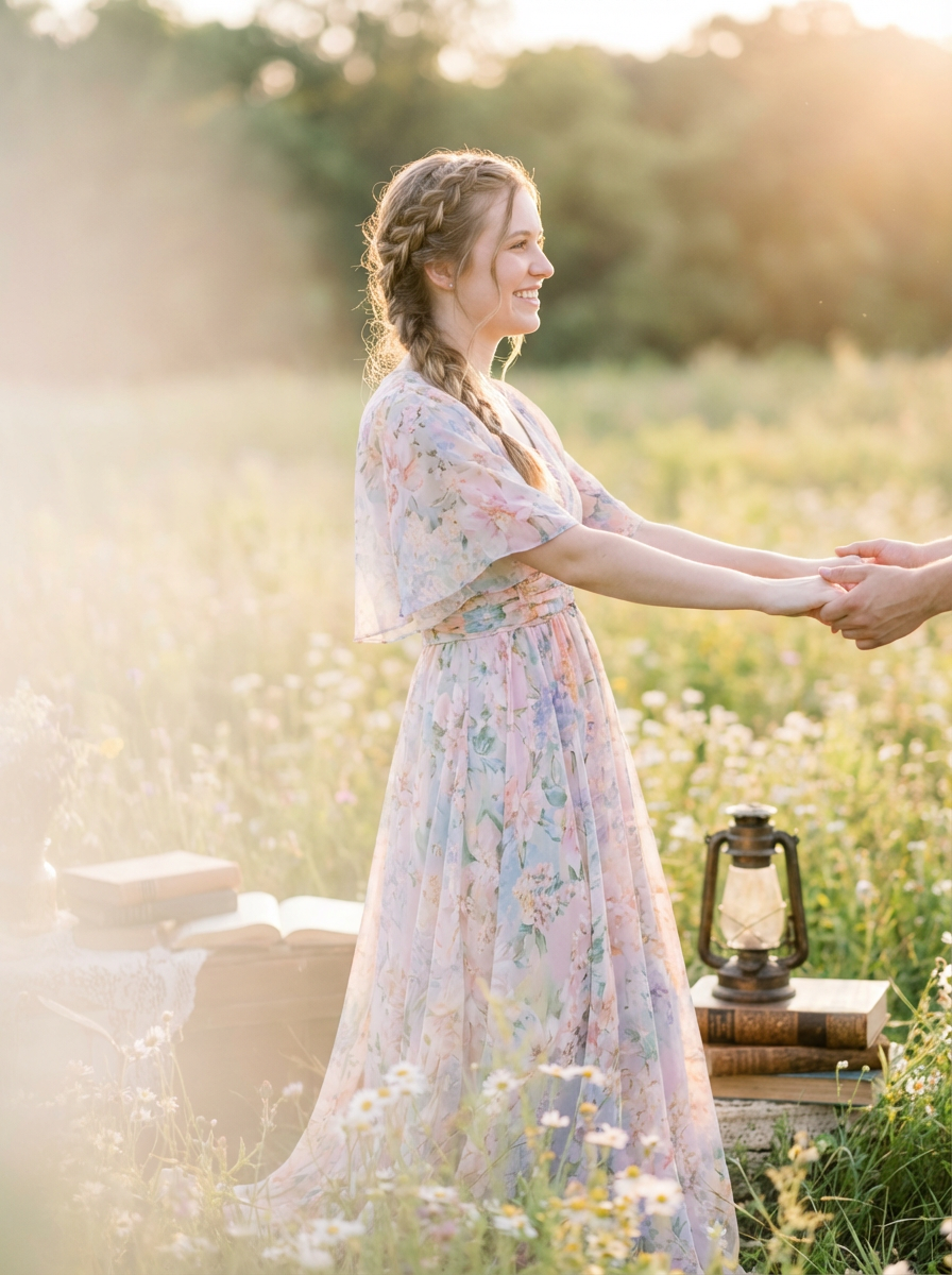 Whimsical engagement shoot in a field of flowers. Model wearing a delicate pastel dress . Romantic and dreamy setting.