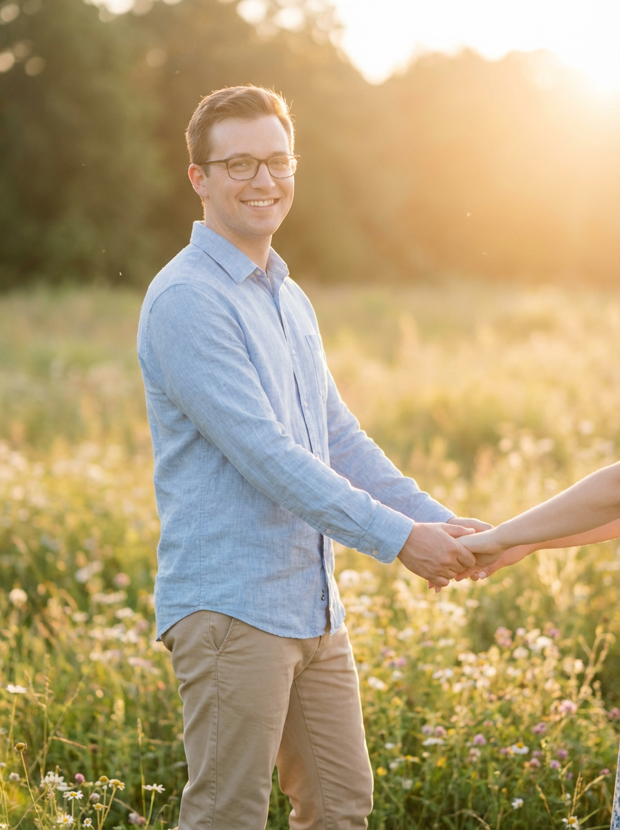 Whimsical engagement shoot in a field of flowers. Model wearing a relaxed button-up shirt . Romantic and dreamy setting.