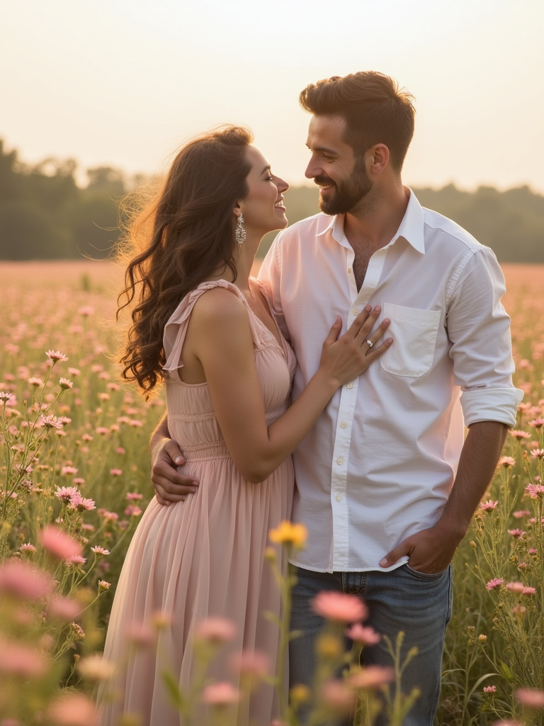 Whimsical engagement shoot in a field of flowers. Wearing a delicate pastel dress . Romantic and dreamy setting.