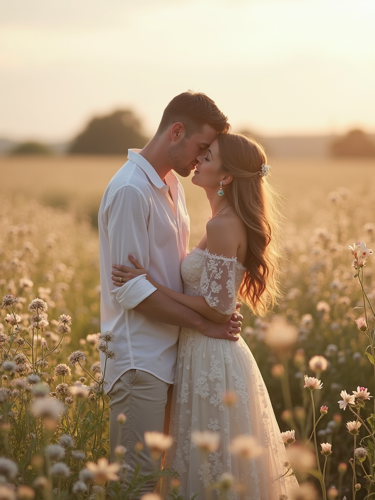 Whimsical engagement shoot in a field of flowers. Wearing a delicate pastel dress . Romantic and dreamy setting.