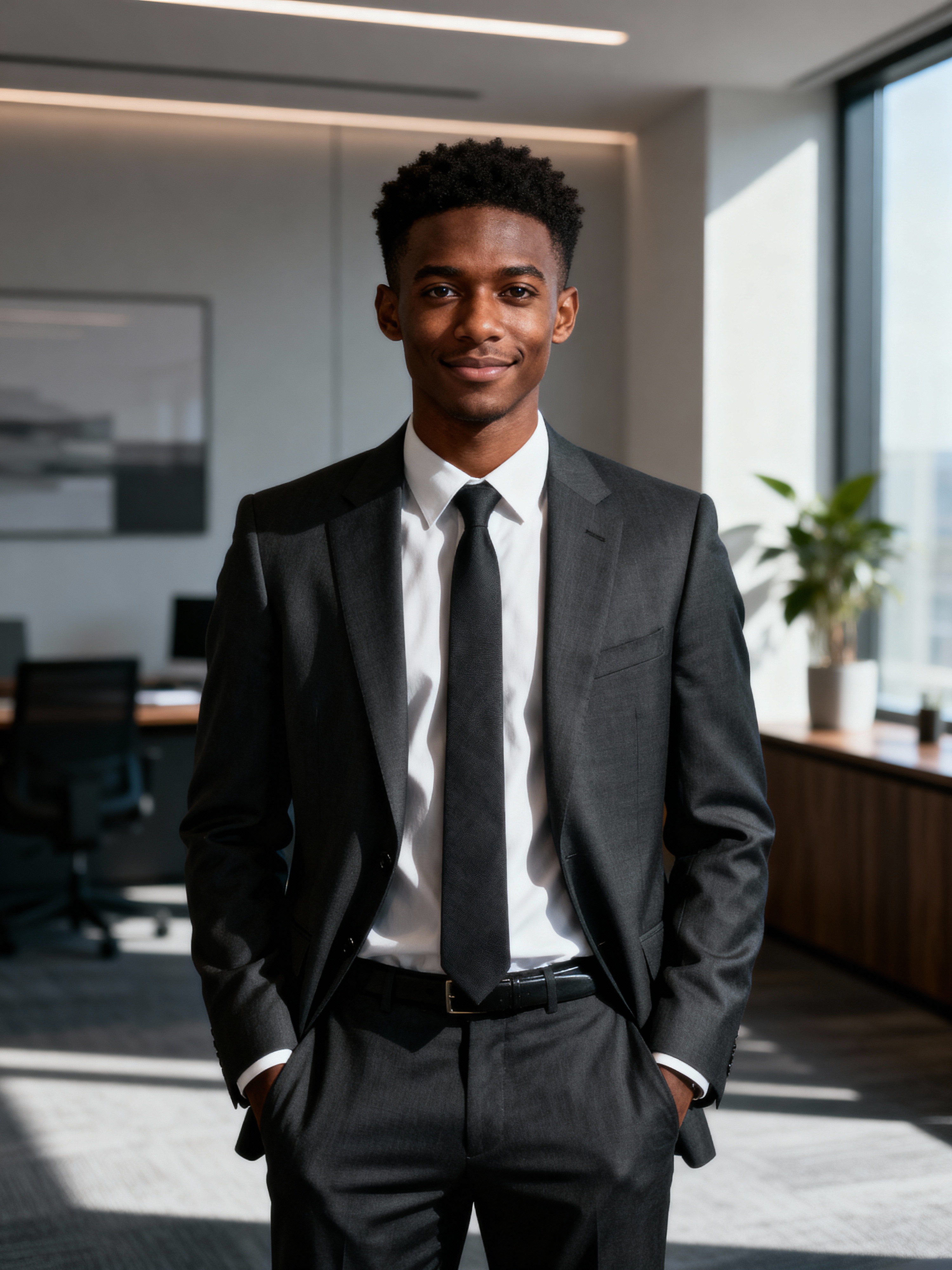 wide LinkedIn profile photo of a professional business model as a confident professional business model standing in a modern office. LinkedIn professional profile photo. most popular person on LinkedIn