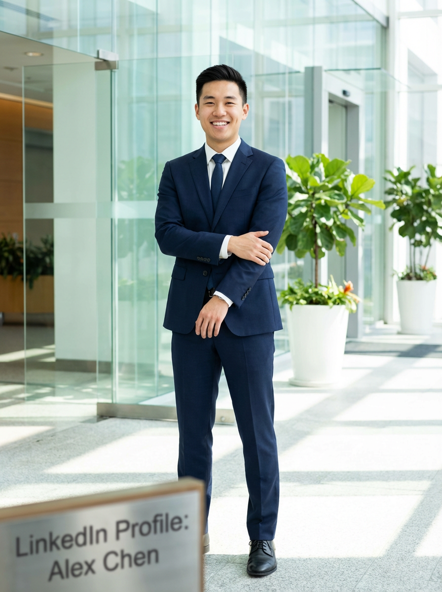 wide LinkedIn profile photo of a professional business model as a confident professional business model standing in a modern office. LinkedIn professional profile photo. most popular person on LinkedIn